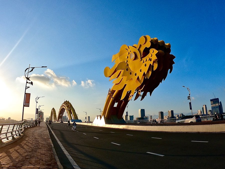 Cầu Rồng với hình dáng một con rồng là con đường ngắn nhất nối Sân bay Quốc tế Đà Nẵng với những đường trục chính trong thành phố. Không chỉ đóng vai trò là đường giao thông huyết mạch của thành phố, cầu Rồng, với kiến trúc mô phỏng con rồng thời Lý đang vươn mình bay ra biển, là một trong những kiến trúc mang tính biểu tượng của thành phố Đà Nẵng. Đặc biệt cứ vào 9 giờ tối thứ 7, chủ nhật hàng tuần, “Rồng” sẽ phun lửa, phun mưa bằng công nghệ hiện đại, khiến cho sông Hàn thêm phần sống động, thu hút. Lửa sẽ được phun trước với 2 lượt, mỗi lượt 9 lần và tiếp theo sau là phun nước với 3 lượt, mỗi lượt 1 lần. Cầu có chiều dài 666m, rộng 37,5m bắc qua sông Hàn. Với kinh phí gần 1,5 tỷ đồng, cây cầu có sáu làn xe và được thông xe lần đầu vào ngày 29/03/2013 nhân dịp kỉ niệm 38 năm ngày giải phóng thành phố Đà Nẵng.