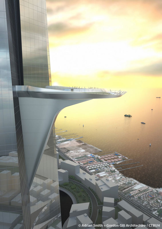 Một điểm độc đáo khác của thiết kế là sân thượng đường kính khoảng 30m ở tầng 157. Sân thượng sẽ mở cửa cho khách tham quan. Đây sẽ là đài quan sát cao nhất thế giới sau khi mở cửa.
