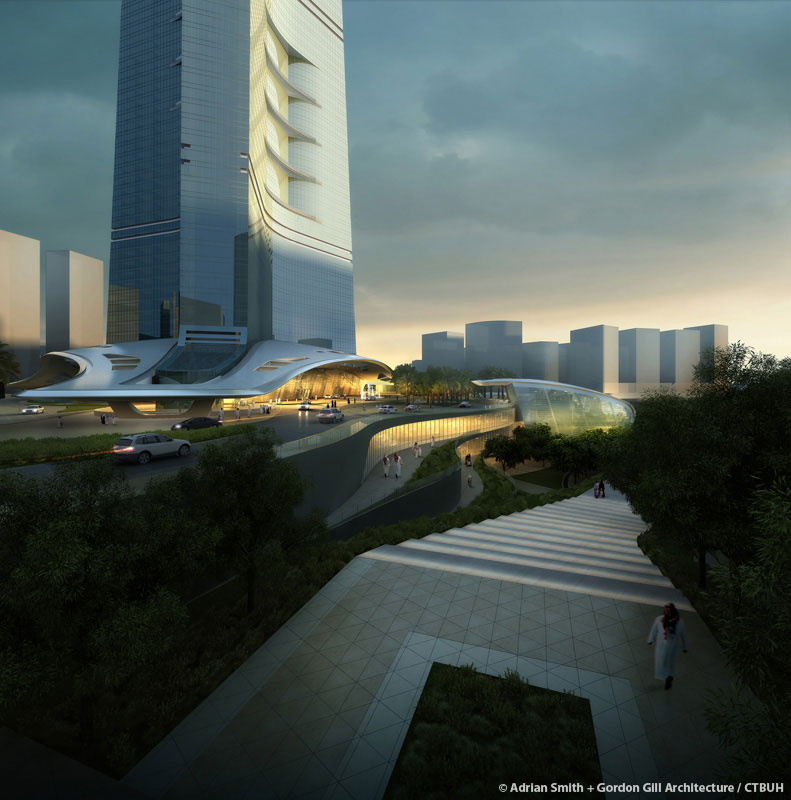 Tháp được thiết kế bởi kiến trúc sư người Mỹ Adrian Smith – cũng là người thiết kế Burj Khalifa – hiện nắm kỷ lục là tòa nhà cao nhất thế giới. Tòa tháp nổi bật với thiết kế thanh mảnh lấy cảm hứng từ hình dáng lá của một loài hoa bản xứ mọc giữa đất cát của sa mạc khô cằn.