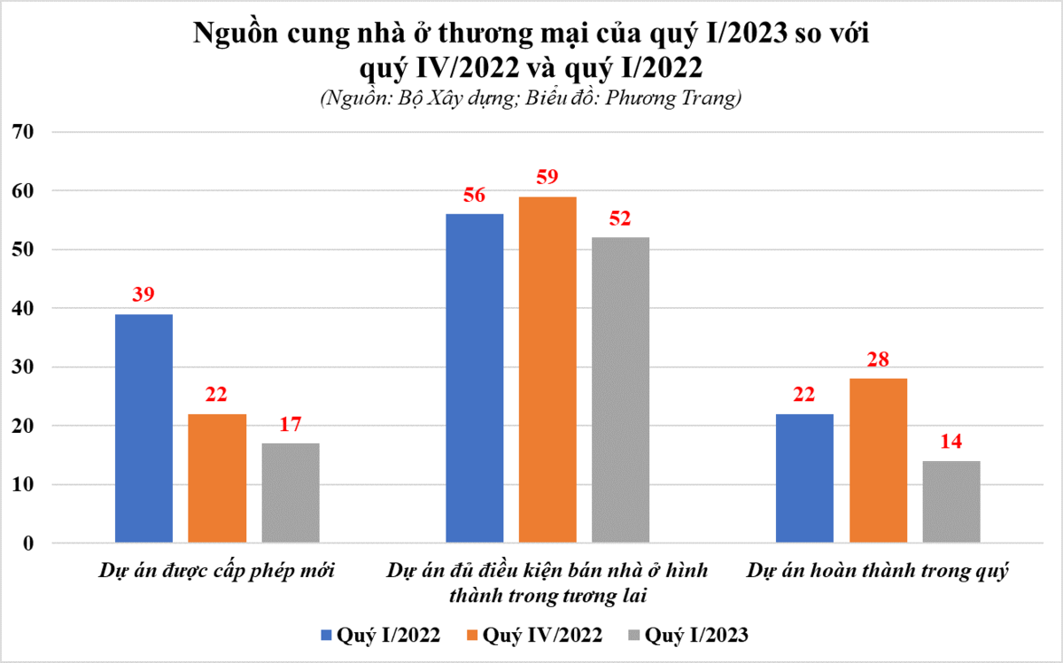 Theo thống kê mới đây về thị trường bất động sản quý I/2023 của Bộ Xây dựng, dự án phát triển nhà ở thương mại trong quý I/2023 có 14 dự án, số lượng dự án bằng khoảng 50% so với quý IV/2022 và bằng 63% so với cùng kỳ năm 2022.