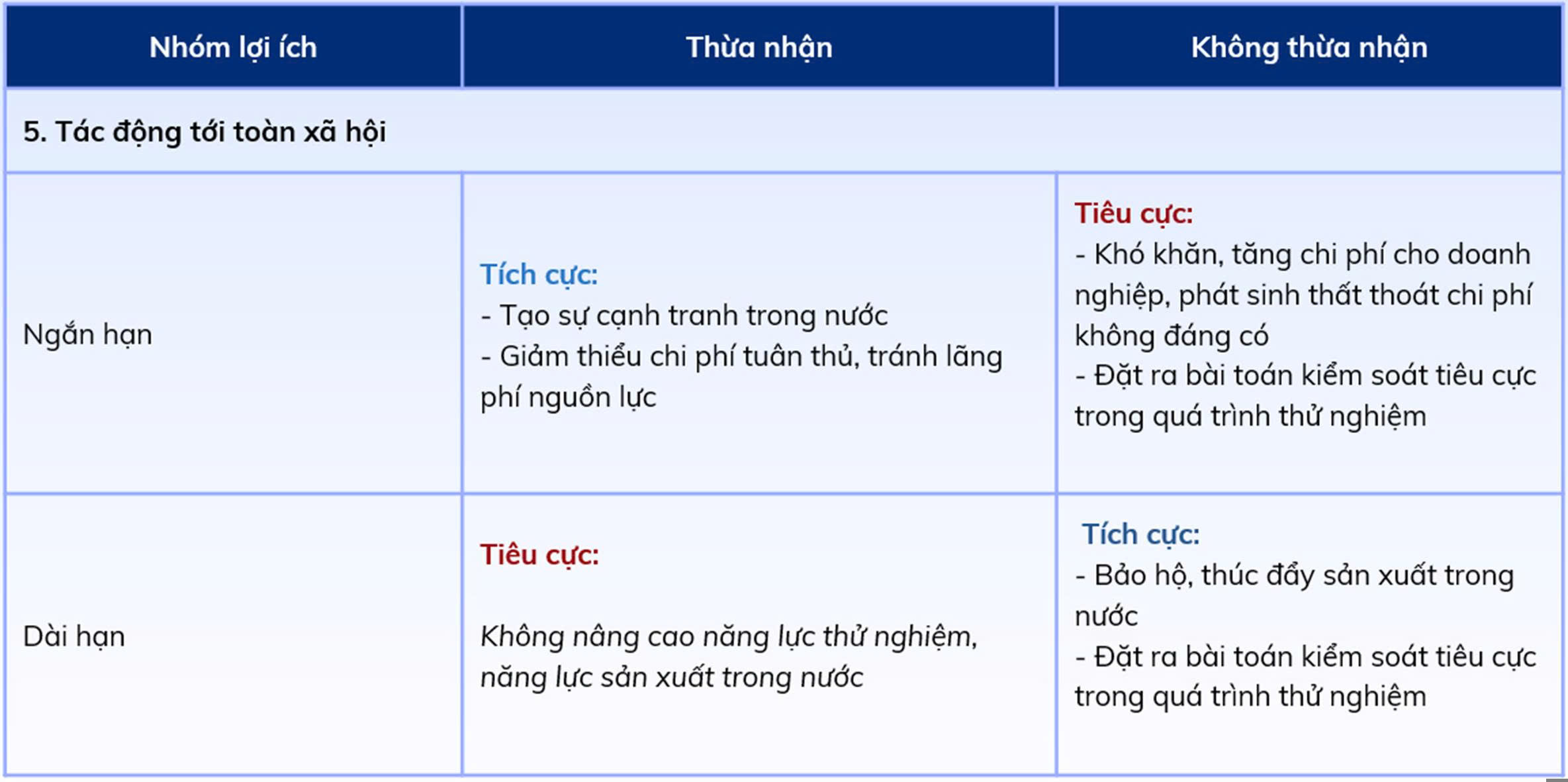 Ngược lại, việc không thừa nhận đơn phương tuy có thể tạo áp lực trong ngắn hạn, nhưng lại góp phần thúc đẩy doanh nghiệp nội địa đầu tư nghiên cứu, phát triển sản phẩm và nâng cao hạ tầng thử nghiệm trong nước… nhưng đồng thời đặt ra một bài toán lớn về cơ chế giám sát để phòng tránh tiêu cực trong hoạt động thử nghiệm.