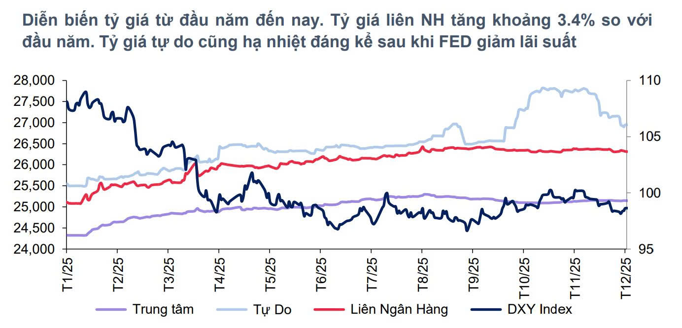 Về triển vọng năm 2026, nhóm phân tích MBS dự báo tỷ giá sẽ tăng khoảng 2,5% - 3% trong năm 2026, áp lực tỷ giá vẫn khá lớn trong nửa đầu năm 2026.