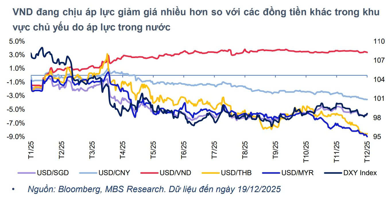 Theo MBS, điều này chủ yếu xuất phát từ các yếu tố nội tại như: (1) chênh lệch lãi suất giữa VND và USD; (2) thặng dư thương mại thu hẹp hơn trong năm 2025; (3) nhu cầu ngoại tệ gia tăng khi Kho bạc Nhà nước có tới 14 đợt mua USD từ các ngân hàng thương mại kể từ đầu năm đến nay với tổng giá trị đạt 2,29 tỷ USD (vượt mức 2,08 tỷ USD được mua trong cả năm 2024); (4) chênh lệch giá vàng trong nước và thế giới trong bối cảnh giá vàng tăng khiến nhu cầu đầu cơ tăng.