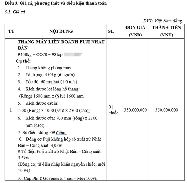 Báo giá thang máy của một doanh nghiệp chào bán “Thang máy liên doanh Fuji Nhật Bản” với mức giá chỉ 350 triệu đồng cho thang máy 450kg – 9 điểm dừng.