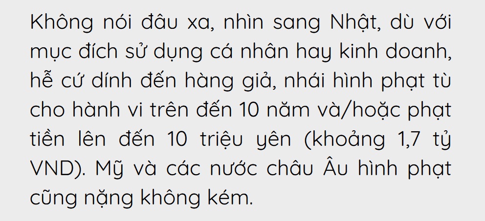 Chúng ta phải tăng chế tài xử phạt, không nói đâu xa, nhìn sang Nhật, dù với mục đích sử dụng cá nhân hay kinh doanh, dính đến hàng giả, nhái hình phạt tù cho hành vi trên đến 10 năm và/hoặc phạt tiền lên đến 10 triệu yên (khoảng 1,7 tỷ VND). Mỹ và các nước châu Âu hình phạt cũng nặng không kém.