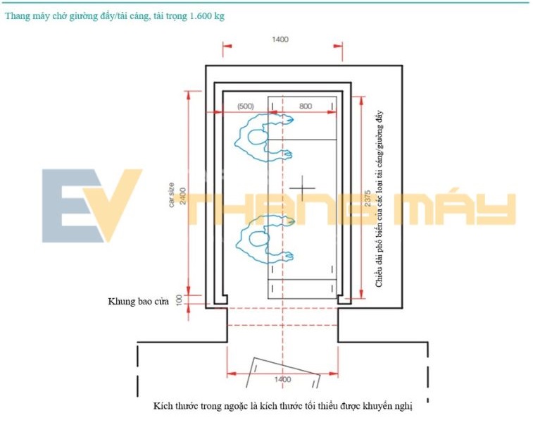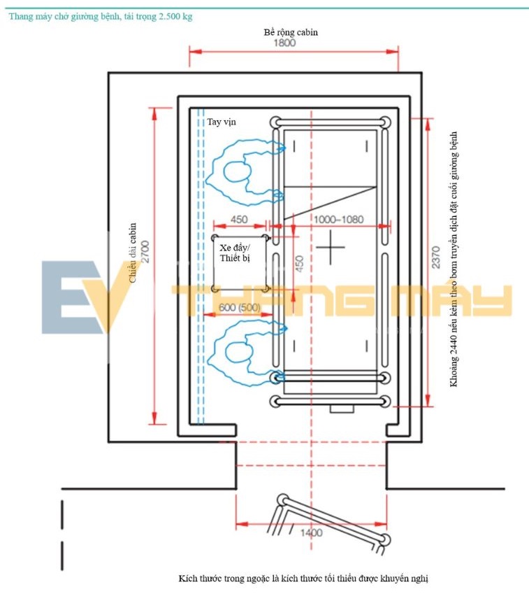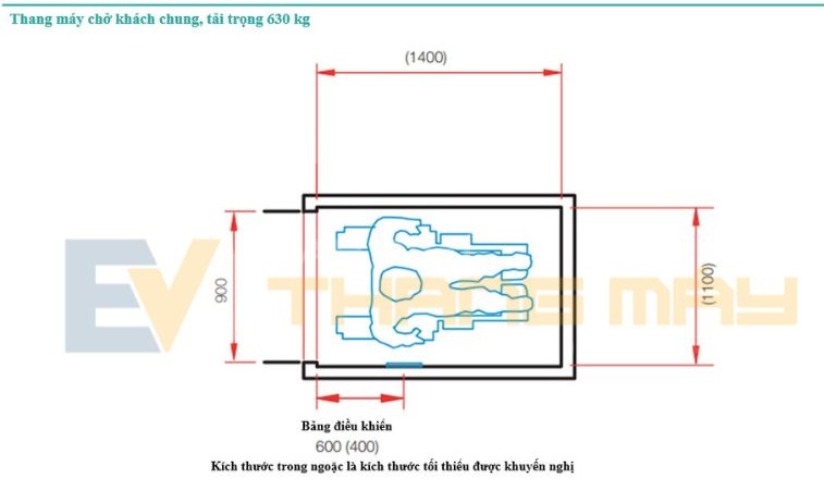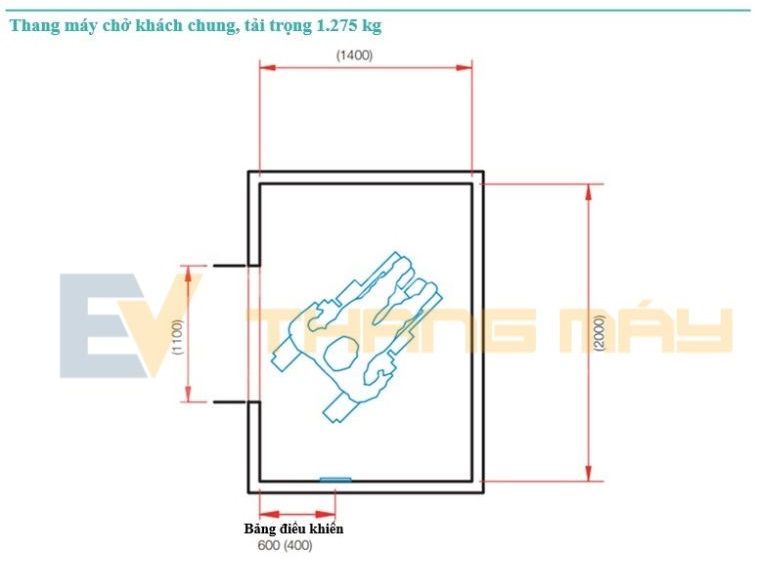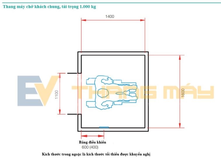 Kích thước khuyến nghị cho thang máy chở khách chung là loại có tải trọng định mức 1.275 kg (tối đa 17 người), diện tích sàn cabin rộng 2.000 mm x sâu 1.400 mm và chiều rộng cửa mở thông thủy 1.100 mm. Thang máy này đảm bảo khả năng tiếp cận đầy đủ cho người sử dụng xe lăn thủ công/điện, đồng thời cấp đủ không gian để quay đầu xe lăn trong cabin thang máy (Hình 1).