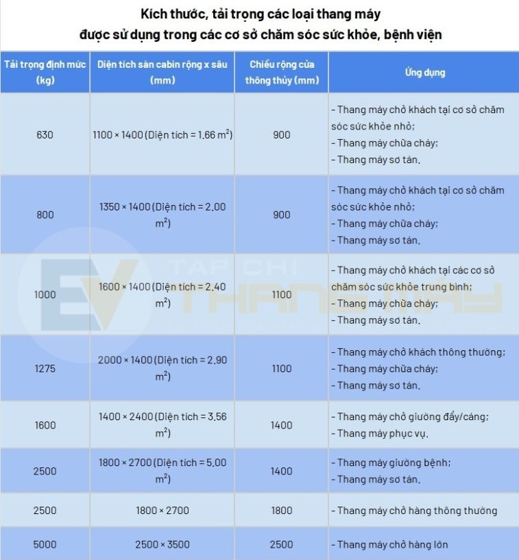 Trong các tòa nhà chăm sóc sức khỏe, bệnh viện có hệ thống thiết bị lớn, được vận chuyển thường xuyên, có thể cân nhắc thang máy chở hàng có tải trọng định mức lên đến 5.000 kg với diện tích sàn cabin rộng 2.500 mm x sâu 3.500 mm và chiều rộng cửa mở thông thủy 2.500 mm.