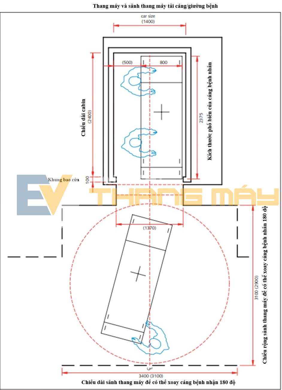 Một thang máy chở giường đẩy/cáng cần có tải trọng định mức tối thiểu 1.600 kg với diện tích sàn cabin thông thủy rộng 1.400 mm x sâu 2.400 mm và cửa mở thông thủy rộng 1.400 mm. Nếu thang máy này được sử dụng như thang máy chở khách chung (tại phần 1), thì tay vịn lắp đặt bên trong cabin không được làm giảm không gian thông thủy của cabin (Hình 4).