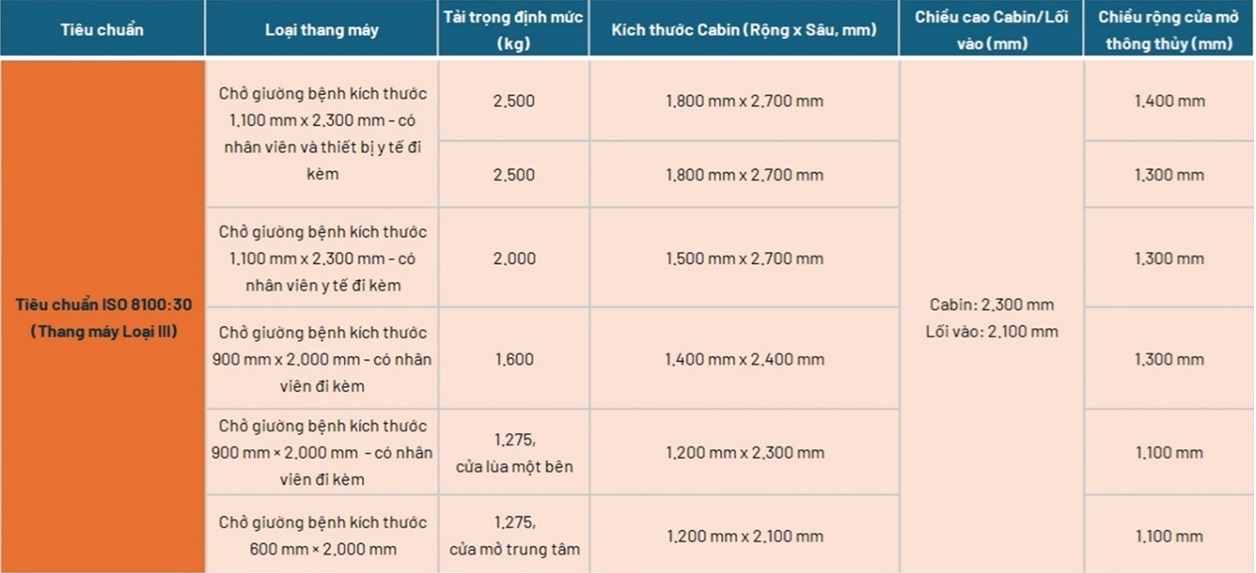 So sánh lựa chọn thang máy dựa trên TCVN thiết kế, xây dựng bệnh viện và Tiêu chuẩn ISO 8100-30 (Thang máy Loại III)