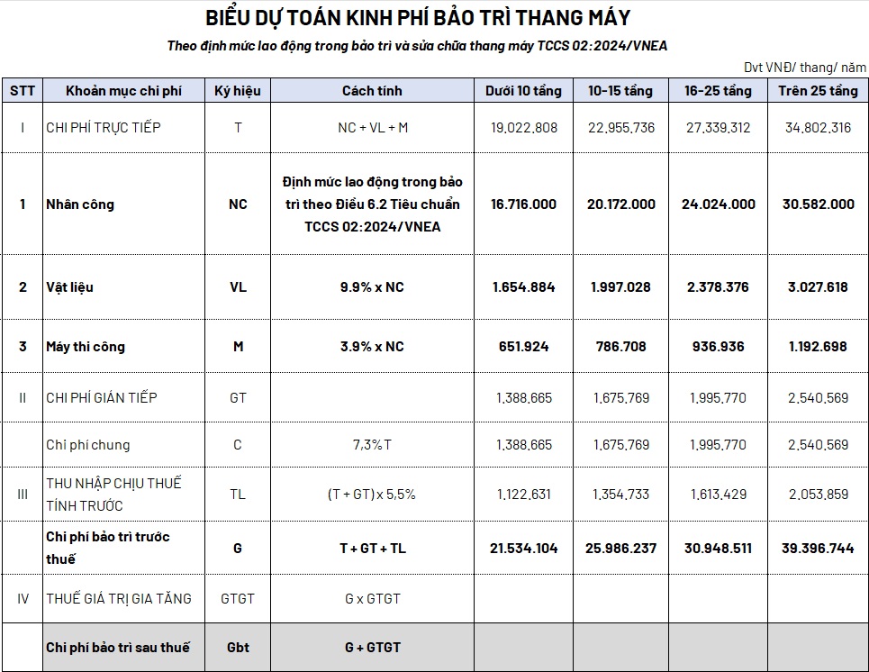 Từ các phân tích trên, có thể tham khảo biểu sau để tính chi phí bảo trì thang máy. Biểu này không chỉ giúp các đơn vị chuyên môn về bảo trì thang máy tính đơn giá bảo trì, tổ chức bộ máy vận hành dịch vụ mà còn đặc biệt hữu ích cho các đơn vị sử dung thang máy trong việc xây dựng, cấp kinh phí cho việc bảo trì thang máy thuộc quyền quản lý của mình.