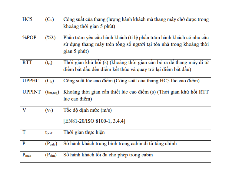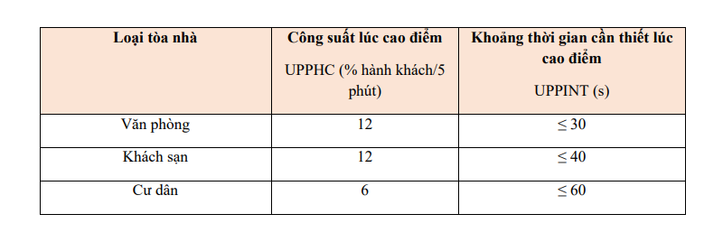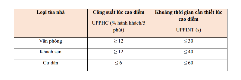 Khoảng thời gian cần thiết lúc cao điểm cho khách sạn tầm trung ở Anh là ≤ 60s (không phải là 40s). Người đọc được khuyên là tuân theo giá trị CIBSE. Bảng 3 đưa ra các tiêu chuẩn thiết kế điển hình với giao thông trộn lẫn cho các mô phỏng với một số điều kiện di chuyển nhưng công suất yêu cầu không thay đổi. Người đọc nên xem thêm phần 8 ở bên dưới.