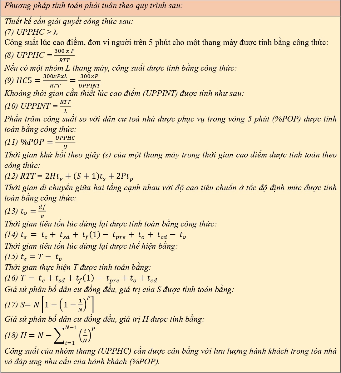 Có hai phương pháp mô phỏng lưu lượng của thang máy: toán học (tính toán) và kĩ thuật số (mô phỏng). Phần này bàn đến phương pháp tính toán. Mô hình toán học đã có từ những năm 1920 [8,9]. Nó trở thành phương pháp nghiên cứu từ những năm 1970 ở Đại học Manchester [2,3]. Các phương pháp hiện tại là sự phát triển của nghiên cứu này. Mô hình toán học dựa trên các phương trình minh bạch, khi được đánh số sẽ cung cấp một câu trả lời có thể lặp lại, có thể được người khác sao chép lại và đạt được kết quả có thể kiểm chứng được. Các công thức tính toán ở tiêu chuẩn ISO 8100-32:2020 là phương pháp Barney-Santos sử dụng trong hơn 50 năm. Nó được trình bày dạng danh pháp, không theo thực hành trong ngành. Điều này có thể gây khó hiểu cho những độc giả quen thuộc với quy ước đã thiết lập. Công thức này được giải thích trong Phần 4 ở trên. Phương pháp tính toán được đề ra trong Bảng 1 ở công thức truyền thống. Giá trị nhận được có thể sử dụng như hướng dẫn cho thiết kế cuối cùng và khởi đầu để mô phỏng. Chúng không nên bắt buộc phải làm theo. Mô hình toán học là phương pháp rất mạnh. Phương pháp được đề cập ở tiêu chuẩn ISO 8100-32:2020 được nhiều người biết đến, nhưng chỉ một trong nhóm mô hình toán học là có.