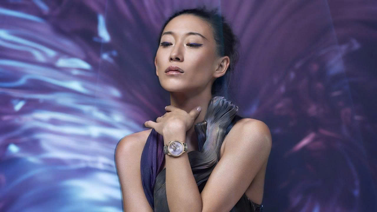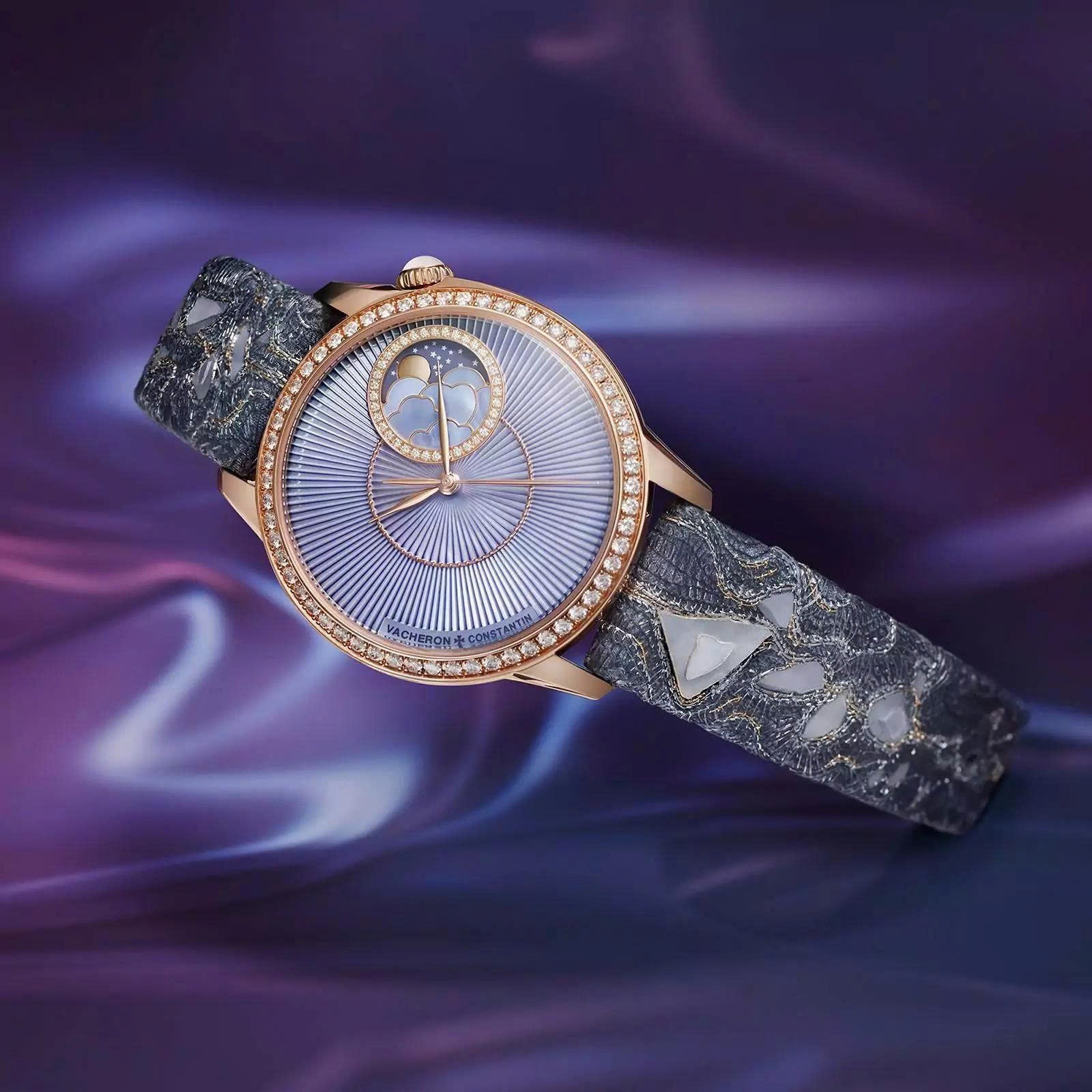 Mẫu đồng hồ 37mm được làm từ vàng hồng với thiết kế nữ tính cùng vành đệm được đính kim cương sắc sảo. Mặt số ngọc trai nổi bật với chỉ báo tuần trăng. Dây đeo do Yiqing Yin thiết kế là sự phối hợp hoàn hảo của sợi tơ mang sắc tử đinh hương mềm mại và những hạt châu xà cừ đan cài giữa tơ lụa, lấp lánh như sương đêm còn đọng trên cánh hoa buổi sớm.