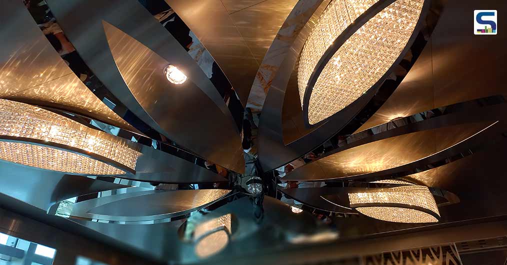 Nội thất của thang máy được thiết kế sang trọng, phá cách nhưng vẫn mang đậm màu sắc văn hóa Ấn Độ. Chủ đề hoa sen là trọng tâm trong phong cách trang trí của Trung tâm thương mại quốc tế Jio, cũng là chủ đề chính của cabin thang máy. Hai màn hình lớn trong cabin cung cấp tin tức và phục vụ giải trí. Một bóng đèn pha lê lớn được trang trí bên trong của chiếc thang máy thu hút sự chú ý của mọi người.