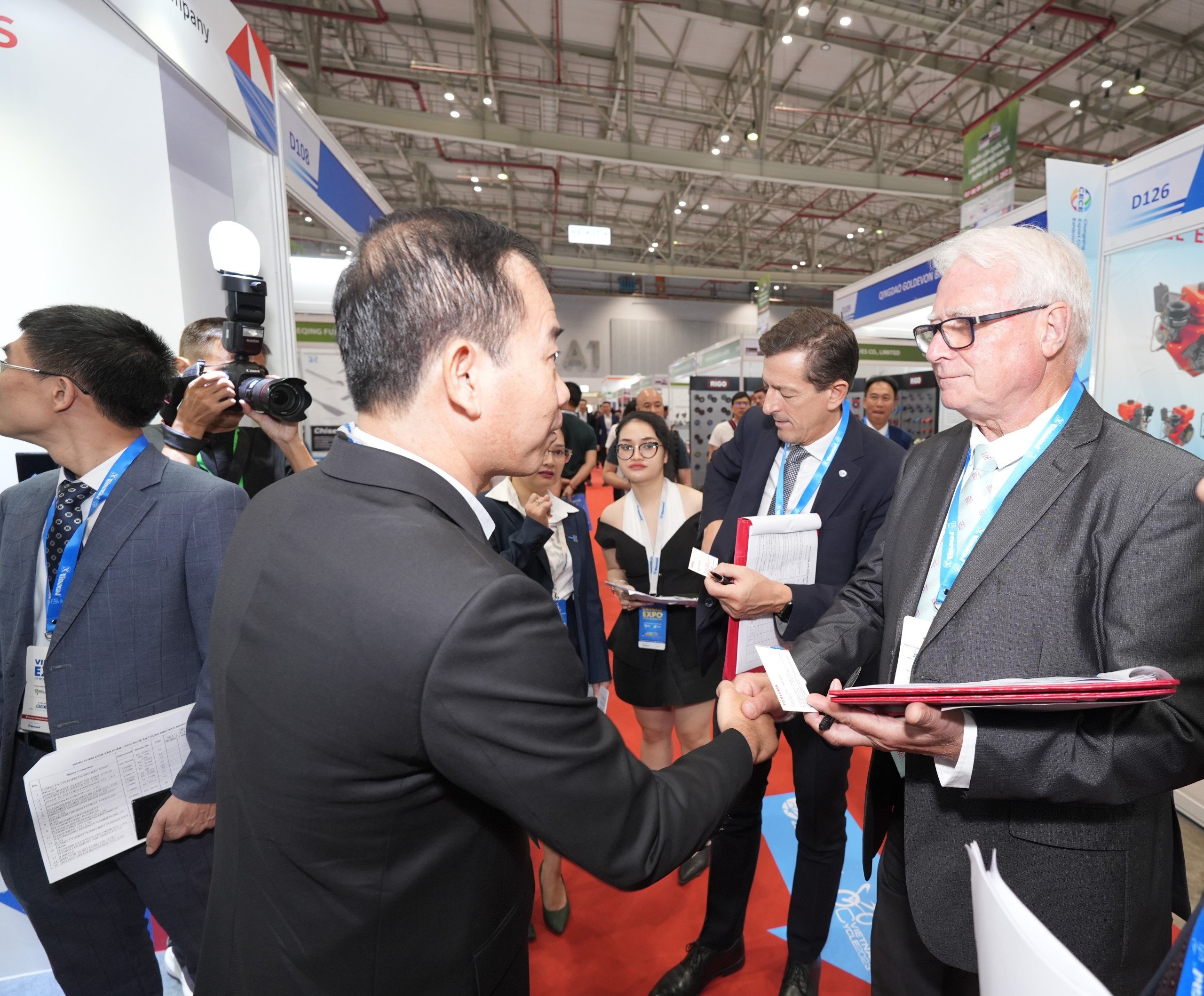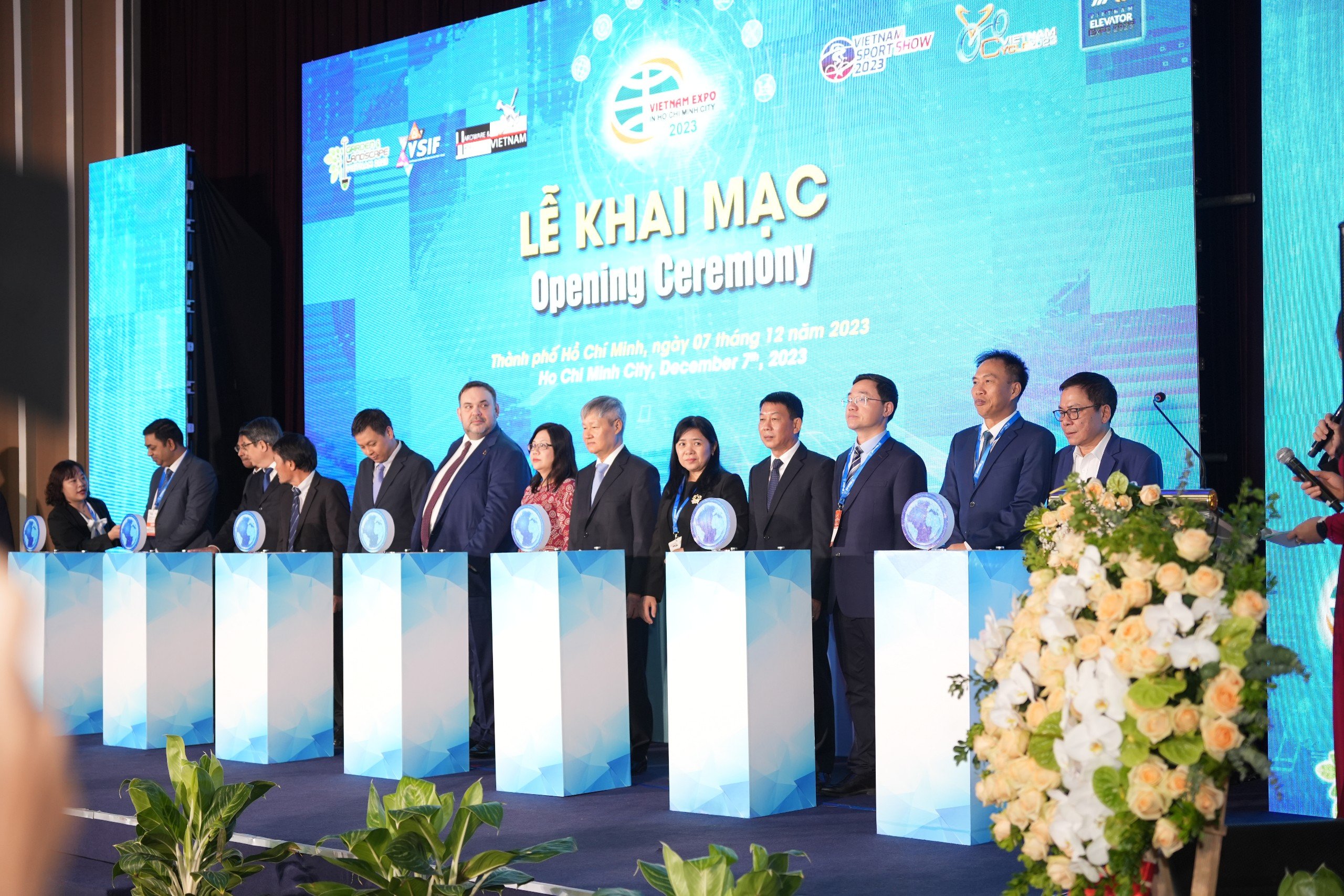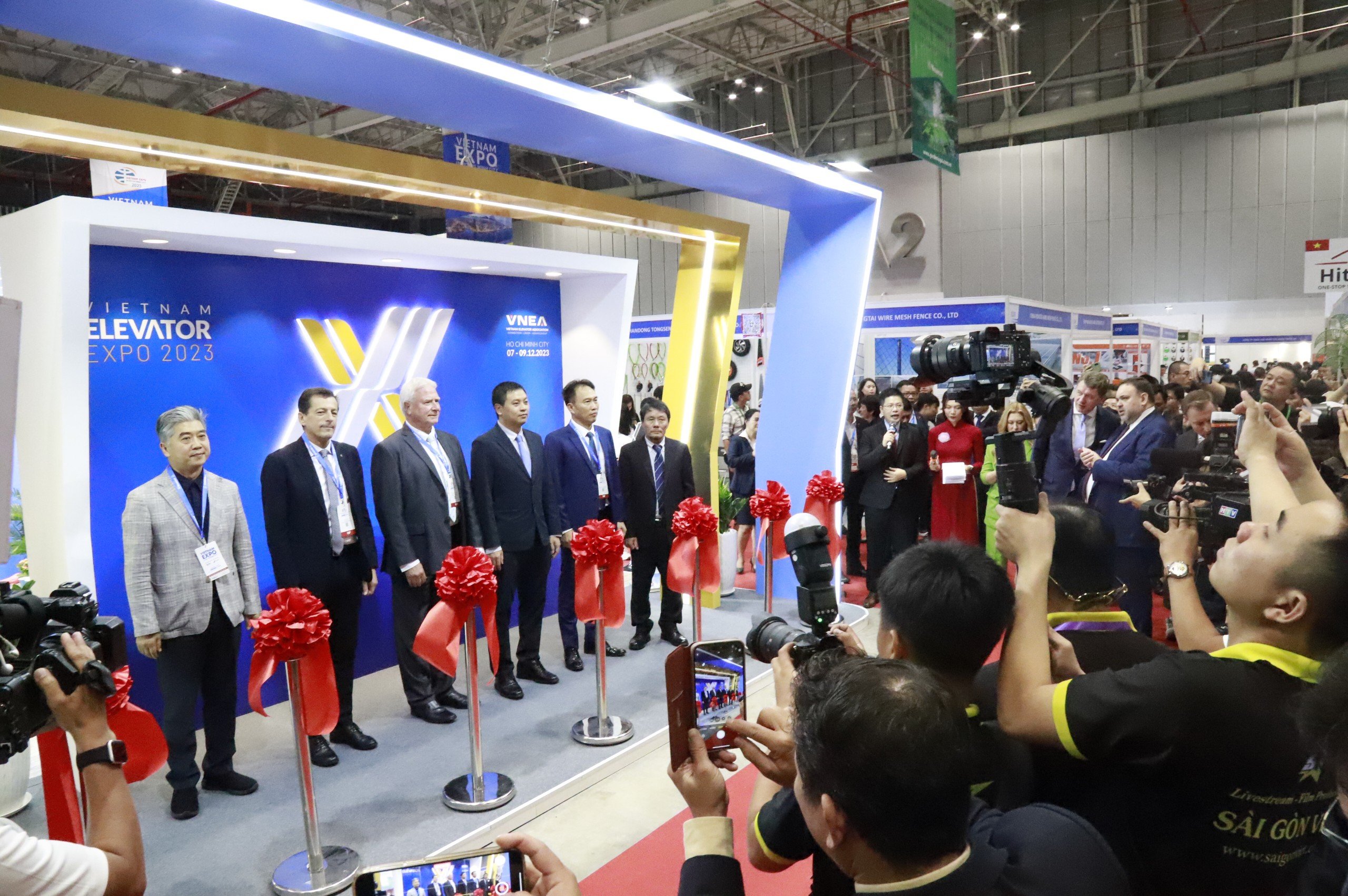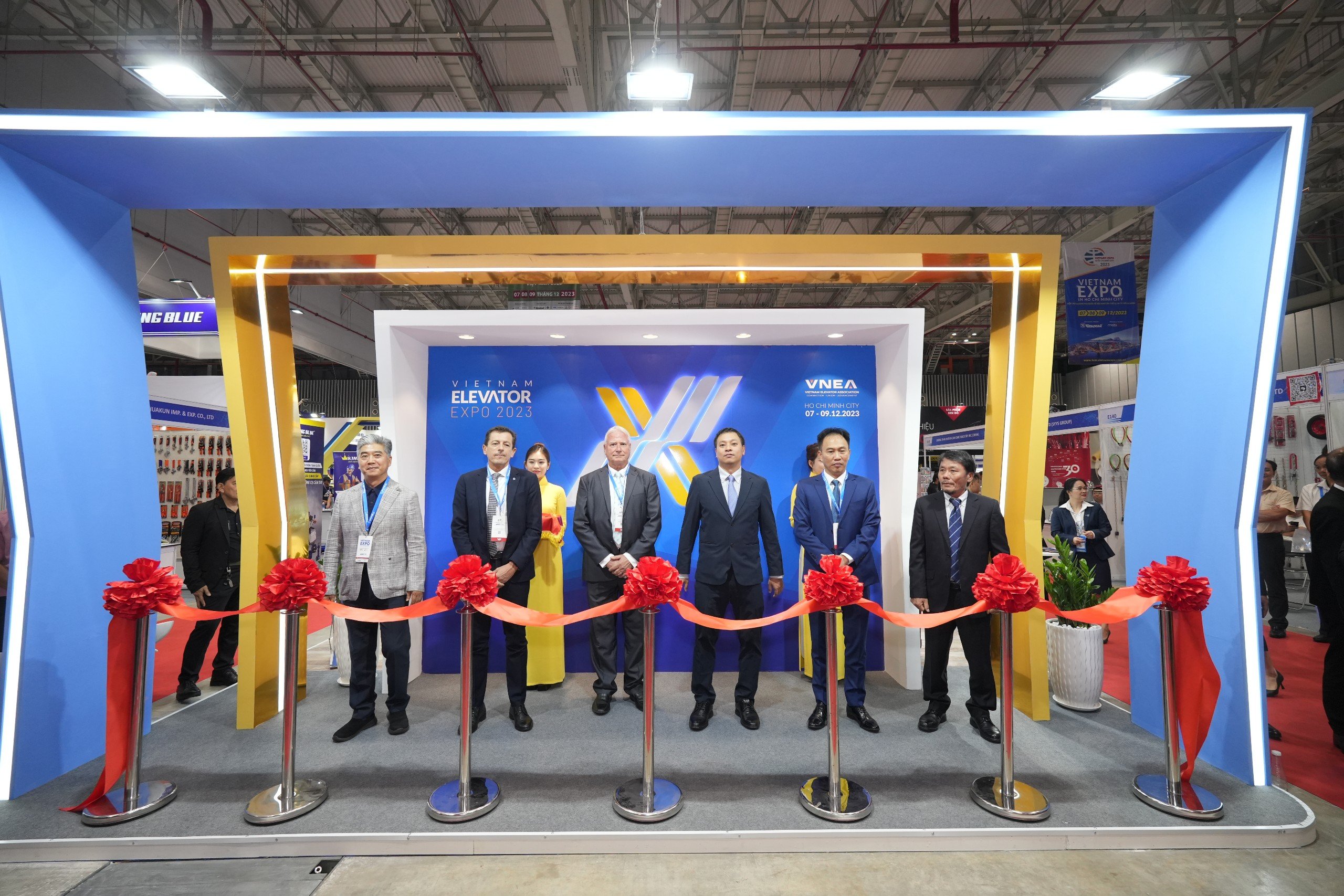 Buổi Lễ cũng vinh dự được đón tiếp Ông Graham Worthington – Chủ tịch Hiệp hội Thang máy Châu Á – Thái Bình Dương; Ông Massimo Bezzi – Chủ tịch Liên đoàn Doanh nghiệp Thang máy Vừa và Nhỏ Châu u; Ông Lee Hyun Suk – Hiệu trưởng Trường Cao đẳng Thang máy Hàn Quốc, cùng cắt băng khai mạc Vietnam Elevator Expo 2023.