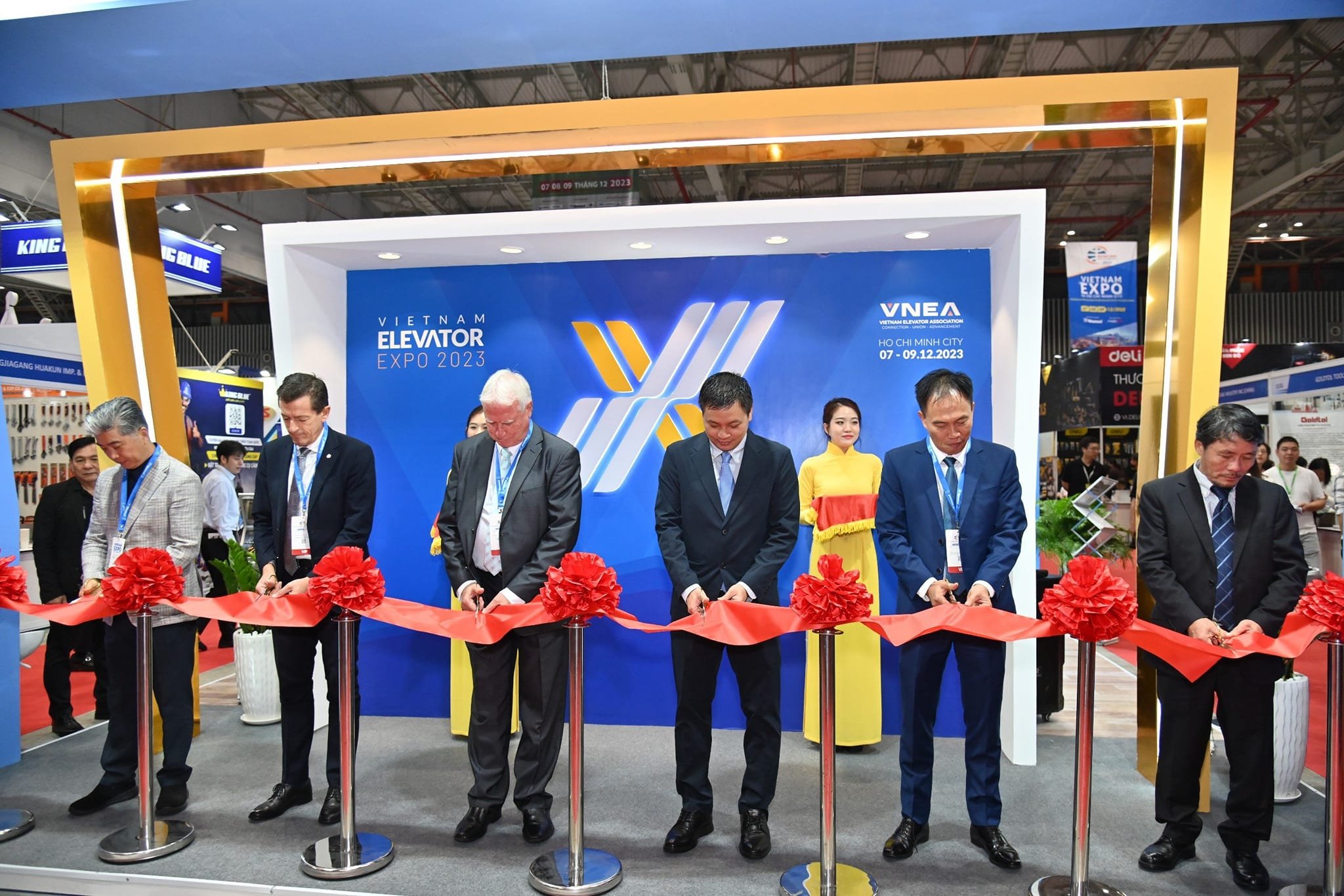 Tại lễ cắt băng khai mạc triển lãm chuyên đề thang máy, Vietnam Elevator Expo 2023 vinh dự có sự tham dự của Ông Tô Ngọc Sơn – Phó Vụ trưởng Vụ Thị trường Châu Á Châu Phi, Bộ Công Thương; Ông Nguyễn Khắc Luận – Chủ tịch VINEXAD; Ông Nguyễn Hải Đức – Chủ tịch VNEA.