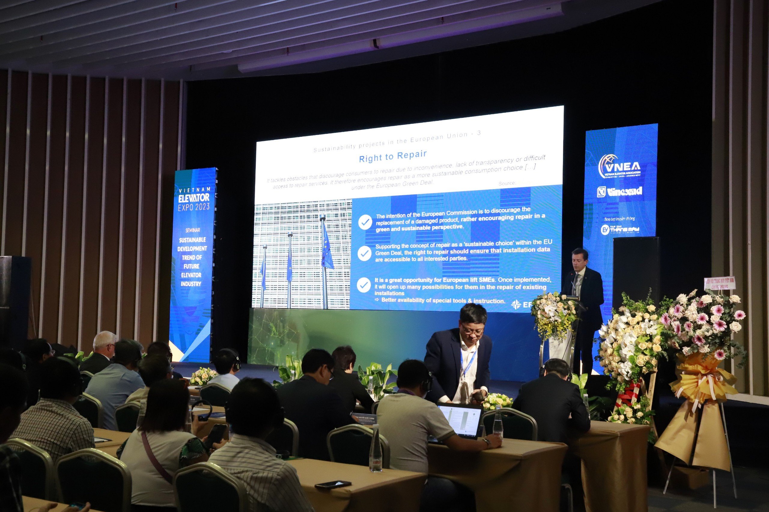 Tiếp nối chuỗi hoạt động xung quanh Triển lãm Vietnam Elevator Expo 2023, ngay trong buổi chiều hôm nay (7/12) đã diễn ra buổi Hội thảo Quốc tế: “Xu hướng phát triển bền vững ngành thang máy tương lai” với sự tham gia của các diễn giả hàng đầu tới từ Hiệp hội Thang máy Châu Á – Thái Bình Dương, Hiệp hội Thang máy Việt Nam và Liên đoàn Doanh nghiệp Nhỏ và Vừa Châu Âu.