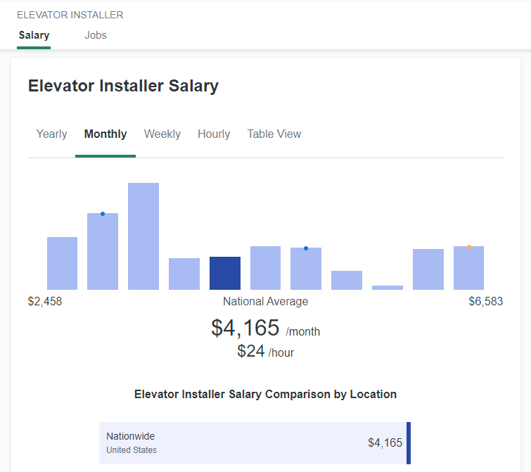 Thống kê của ZipRecruiter – một đơn vị môi giới việc làm của Mỹ (Website có hơn 200.000 lượt truy cập mỗi ngày) thì mức lương trung bình của thợ lắp đặt thang máy tại hơn 50 bang tại Mỹ nằm trong khoảng 2.400 đến 6.500 đô la Mỹ mỗi tháng, đi cùng với đó, mỗi bang tại Mỹ đều có các quy định khác nhau liên quan đến năng lực và các loại chứng chỉ năng lực của người lao động trong ngành thang máy này. (Đọc thêm: Vấn đề chuẩn hóa nhân lực tại các quốc gia trên thế giới và tham khảo nào cho ngành thang máy Việt Nam?)