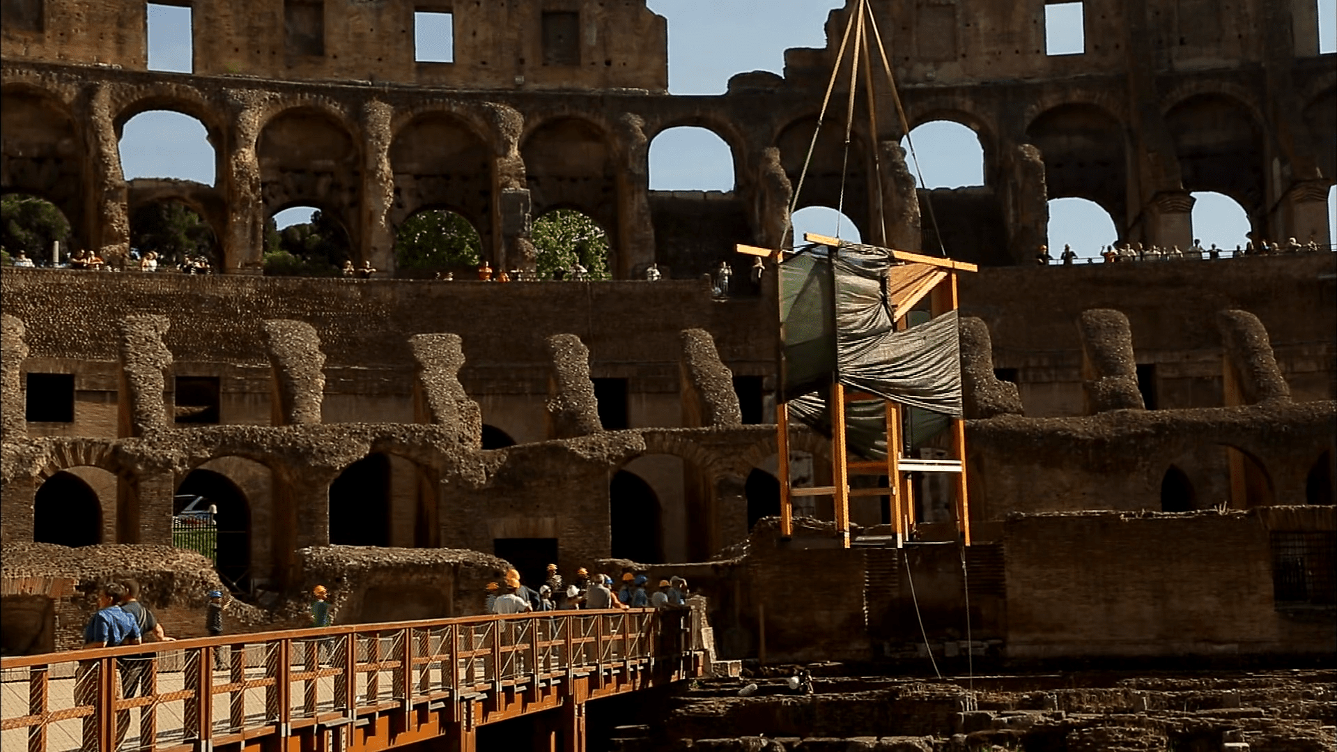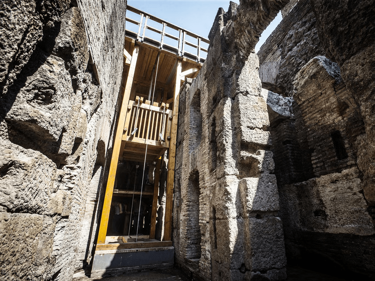 Hệ thống thang nâng/hạ lồng nhốt được các chuyên gia phục dựng lại đã trở thành một phần của đấu trường La Mã thời hiện đại