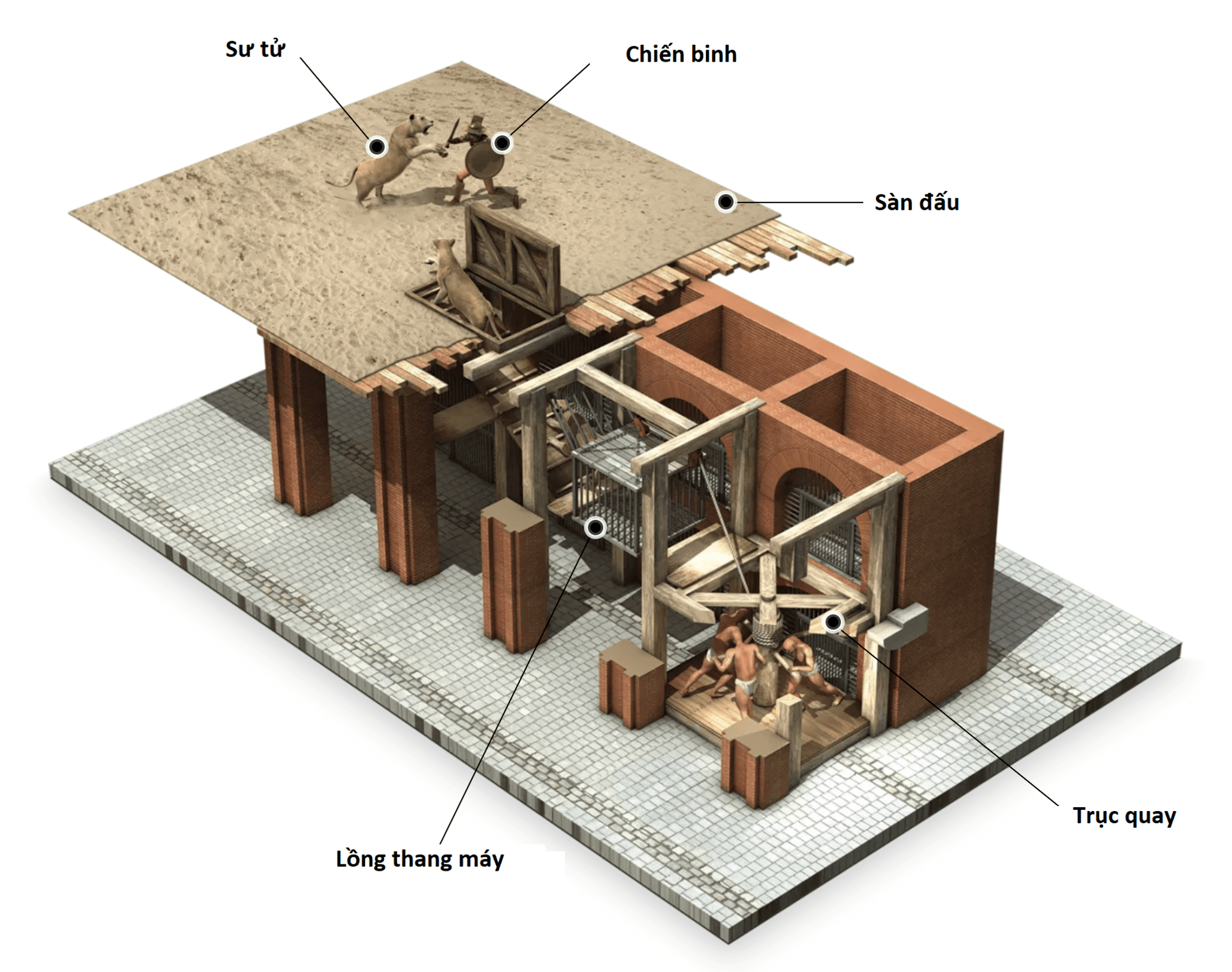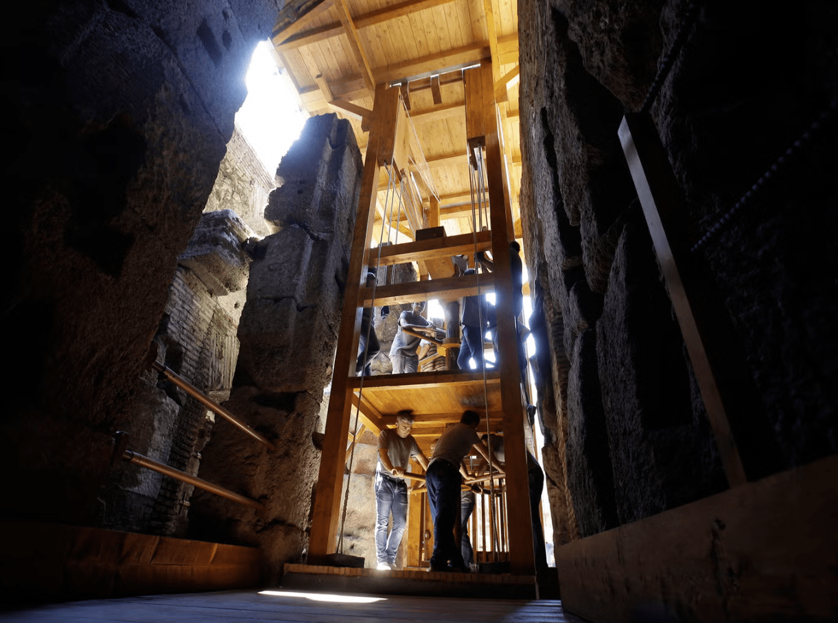 Và như vậy, những người La Mã cổ đại cần thang máy để đưa động vật lên sàn đấu, vì tất cả đều được nhốt dưới lòng đất.