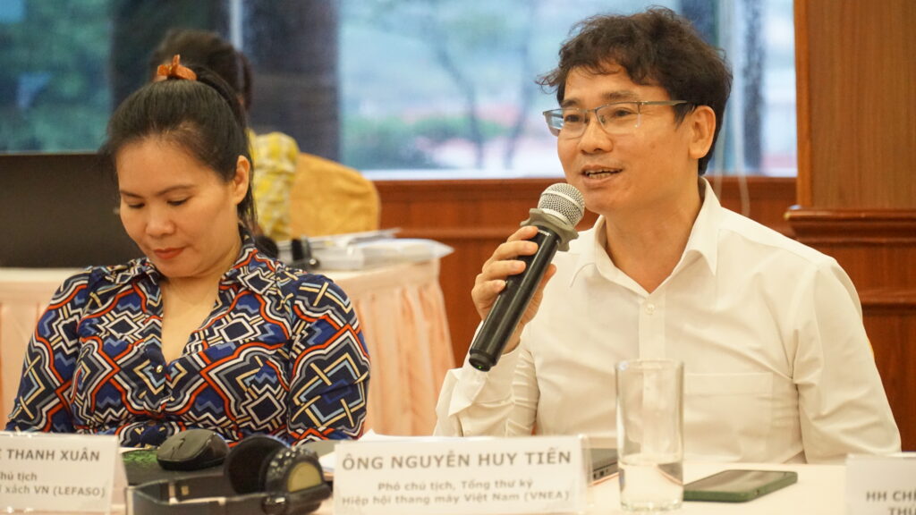 Ông Nguyễn Huy Tiến, Phó Chủ tịch kiêm Tổng Thư ký Hiệp hội Thang máy Việt Nam đóng góp ý kiến tại Tọa đàm