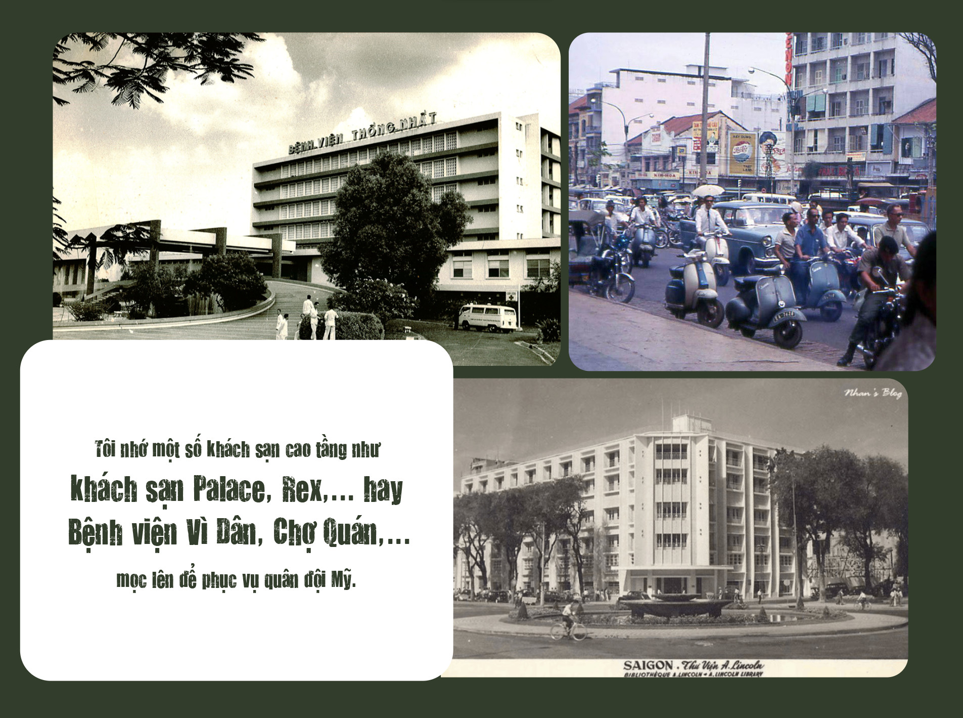 Tôi nhớ một số khách sạn cao tầng được mọc lên để phục vụ quân đội Mỹ, như khách sạn Palace, Rex, Bát Đạt, Phoenix… hay một số cao ốc cho quân đội Mỹ thuê dài hạn như: Prudental, Nguyễn Tấn Đời, 18 Nguyễn Công Trứ… Một số bệnh viện như: Bệnh viện Vì Dân (nay là Bệnh viện Thống Nhất), Bệnh viện 30/4, Bệnh viện Chợ Quán đã được lắp đặt thang máy Otis, một thương hiệu nổi tiếng của Mỹ.