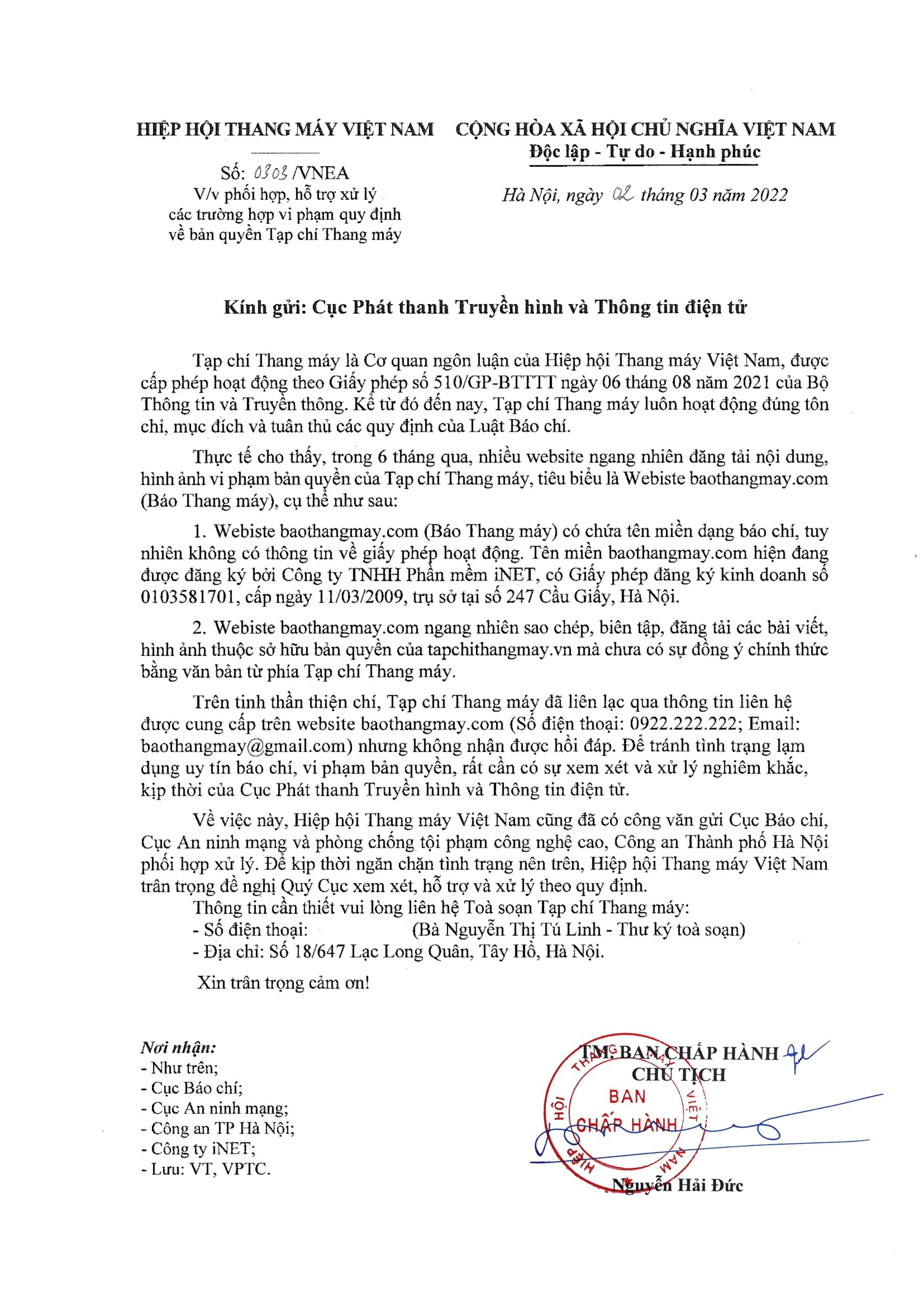 Hướng đến giải quyết sự việc này, Hiệp hội Thang máy Việt Nam – Cơ quan chủ quản của Tạp chí Thang máy đã có công văn gửi đến Công an Thành phố Hà Nội, Cục Báo chí, Cục Phát thanh – Truyền hình và Thông tin điện tử, Cục An ninh mạng và phòng chống tội phạm công nghệ cao phối hợp xử lý.