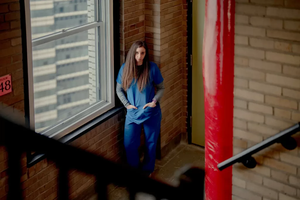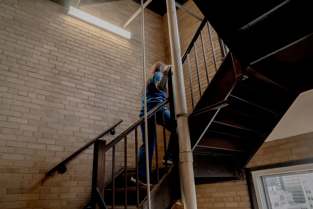 Y tá Erin Campbell thậm chí phải đi bộ lên căn hộ của mình ở tầng 48 sau ca làm việc kéo dài 12 tiếng do thang máy trục trặc – Nguồn: New York Times
