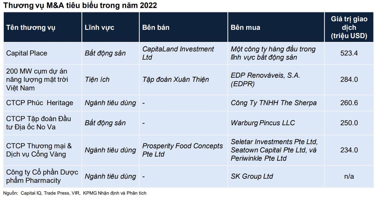 Trong thời điểm năm 2022, thị trường M&A Việt Nam chứng kiến các thương vụ với quy mô lớn từ các nhà đầu tư trong và ngoài nước. Thương vụ lớn nhất trong năm là Capital Place, tòa nhà văn phòng hạng A nằm ở trung tâm Hà Nội, được mua bởi một trong những công ty hàng đầu trong ngành với giá 523,4 triệu USD.