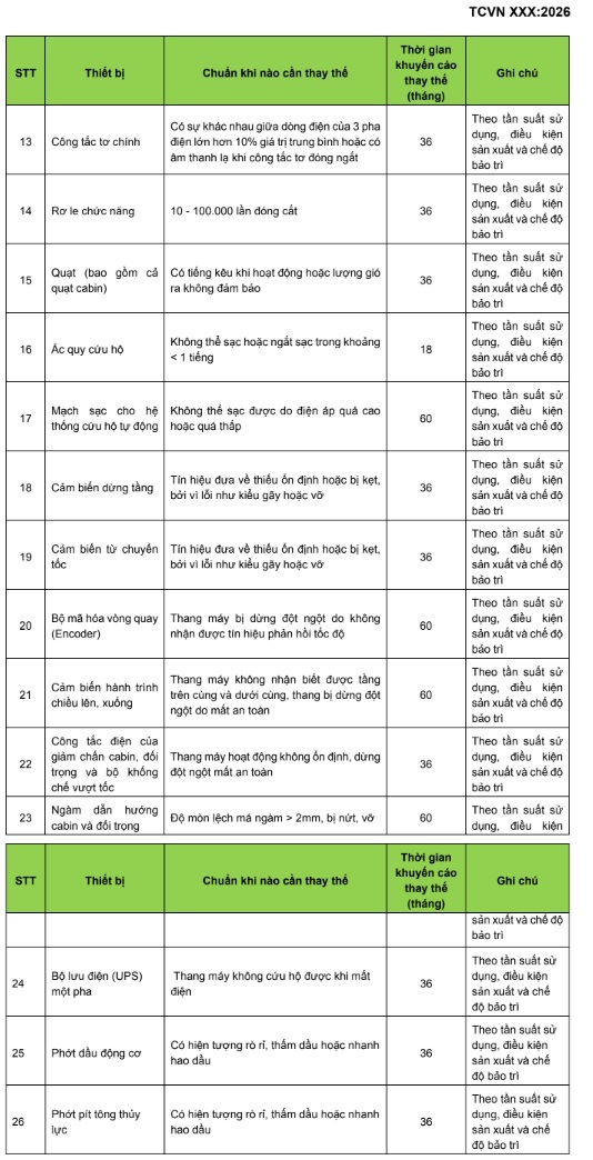 Khuyến cáo tuổi thọ thiết bị hao mòn nhanh của thang máy. (Phụ lục B, Dự thảo TCVN)