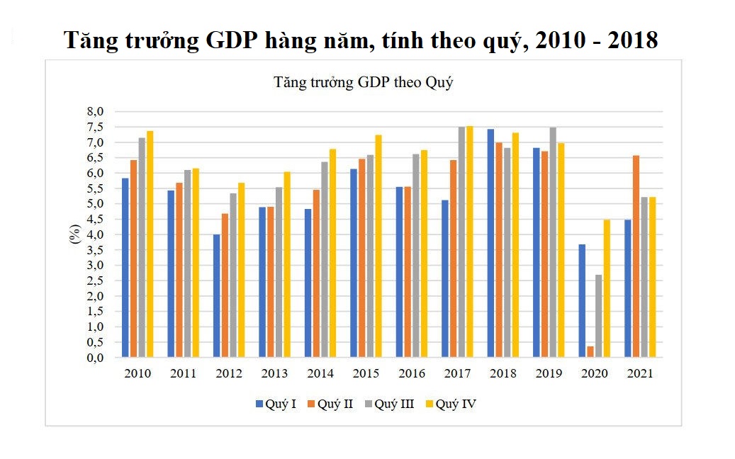 Nếu nhìn lại con số tăng trưởng GDP trong vòng 10 năm qua sẽ thấy một thực tế: Tăng trưởng quý sau cao hơn quý trước nhưng tổng năm sau lại thấp hơn năm trước. GDP cũng lên xuống từng năm như đồ thị hình sin.