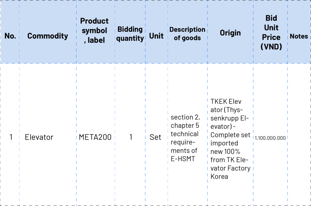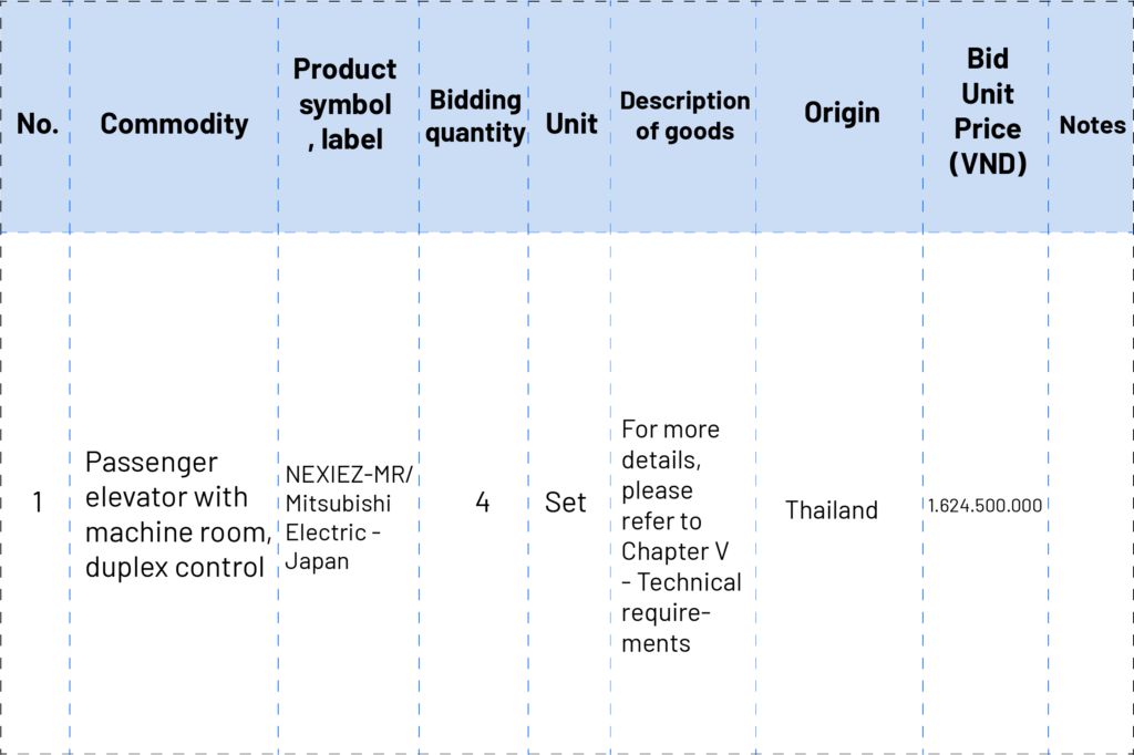 The dossier with code 20210956417-00 belonging to the project to renovate and expand the headquarters of the State Treasury of Tien Giang province also invites online bidding for the elevator package. In the end, the imported elevator from a Korean supplier won the bid.