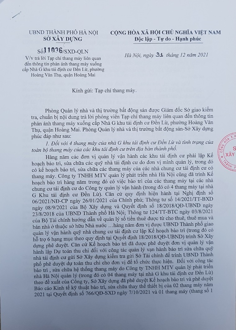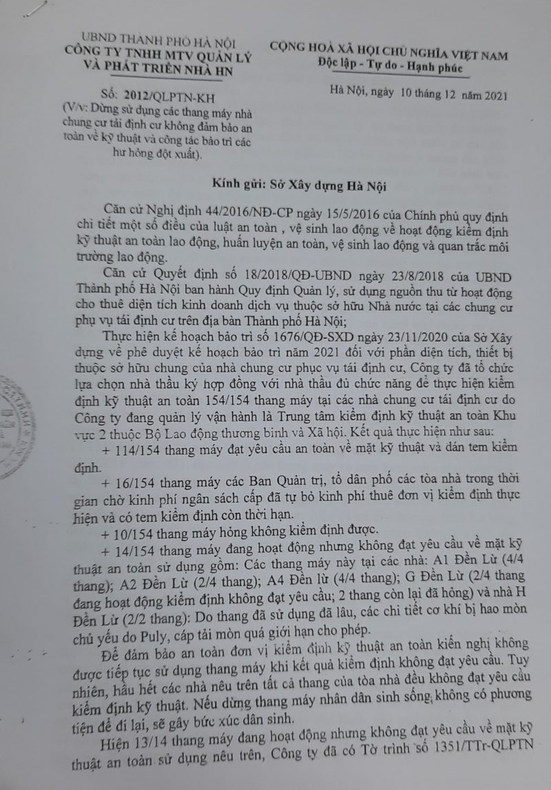 After a lot of documents submitted and reviewed between Hanoi Housing Management and Development One Member Limited Liability Company from the end of 2020 until now about the current status of elevators at Den Lu Resettlement Area, the broken elevators are still in place. Waiting for the day to be repaired, the unapproved elevators still operate in unsafe conditions. Until the Vietnam Elevator Association, Elevator Magazine provided information to the Department of Occupational Safety, the Ministry of Labor, War Invalids and Social Affairs, the Hanoi Housing Management and Development One Member Limited Liability Company officially sent a letter to the Department of Construction, requesting "stop using the elevators of the resettlement apartments that are not technically safe to carry out maintenance work for unexpected damage".