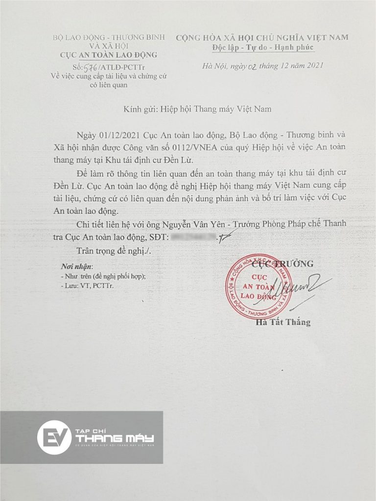 Official letter of Vietnam Elevator Association to the Department of Occupational Safety for information and request for corporate in finding solutions in time to prevent elevator accident problems