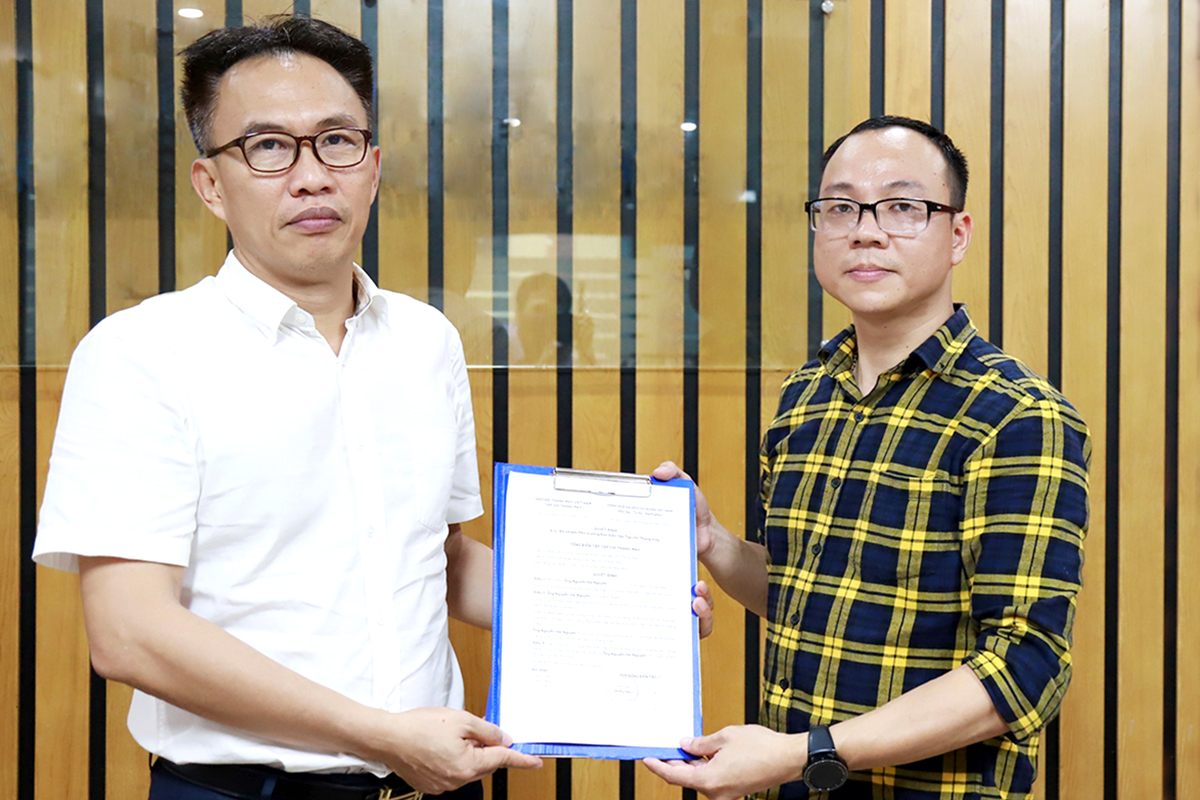 Mr. Nguyen Hai Duc, Chairman of Vietnam Elevator Association (left) hands over the appointment decision to journalist Nguyen Hai Nguyen