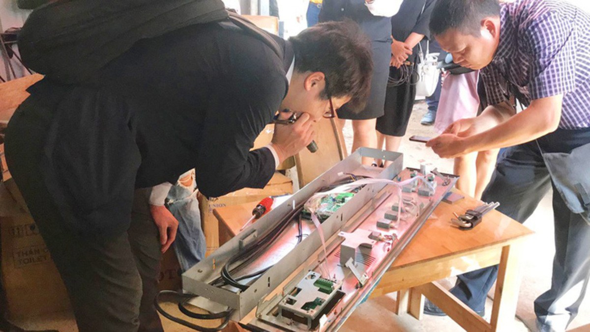Mitsubishi experts checking the fake elevator sold by Hung Quang Company to Van Loc Phat Company.