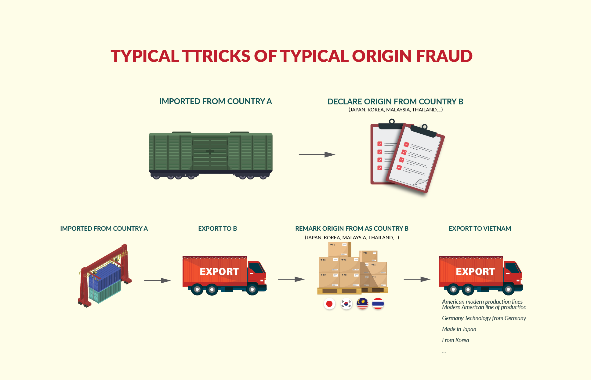 Even numerous firms also take advantage of loopholes to declare false names, types of goods, origins etc. In other cases, businesses conceal the origin and route of shipments, import commodities from country A to country B to attain the status of origin from country B and then re-import these consignments to Vietnam, and attach it with fancy advertisements such as "Made in Japan / Korean technology, ...".