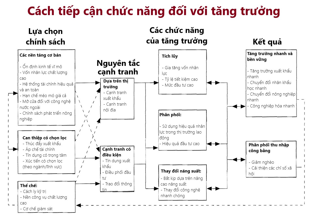 Biểu đồ cho thấy: trong bốn cột, sự tương tác giữa hai khuynh hướng lựa chọn chính sách: (cơ bản và can thiệp chọn lọc); hai phương pháp của nguyên tắc cạnh tranh: (thị trường và thi đua), ba chức năng cơ bản của quản lý kinh tế. Kết quả của các chính sách này được trình bày ở cột cuối cùng. Những đường liền trong biểu đồ mô tả việc lựa chọn các chính sách đóng góp cho thành công của kết quả như thế nào thông qua việc thực hiện ba chức năng cơ bản của quản lý kinh tế. (Biểu đồ: Báo cáo Phép màu Đông Á của World Bank, xuất bản 1993)