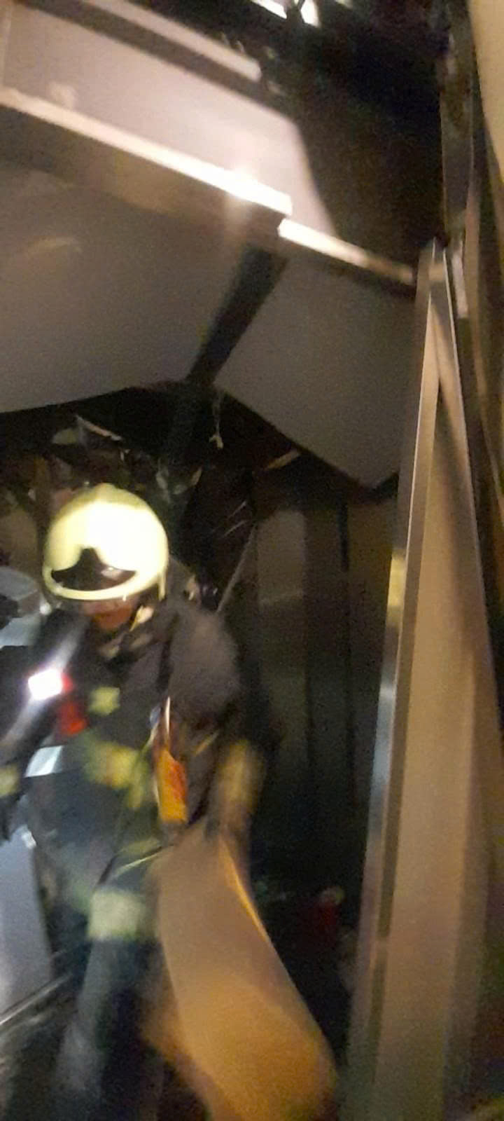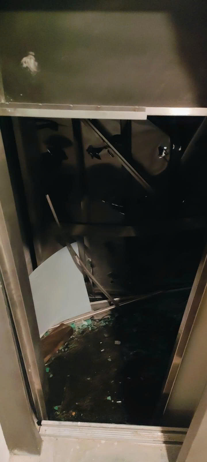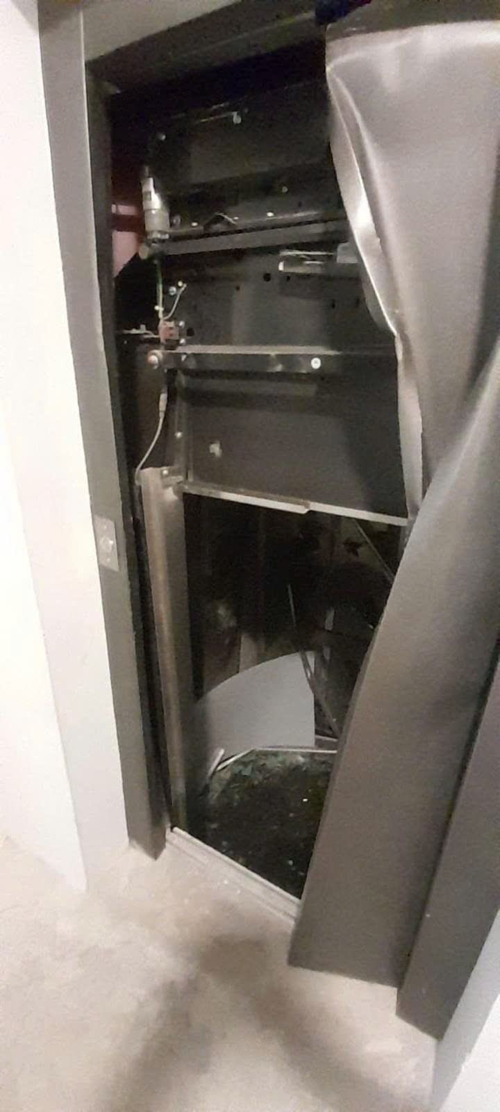 In the released images, the elevator can be seen to be severely damaged, with shattered glass and a collapsed structure.