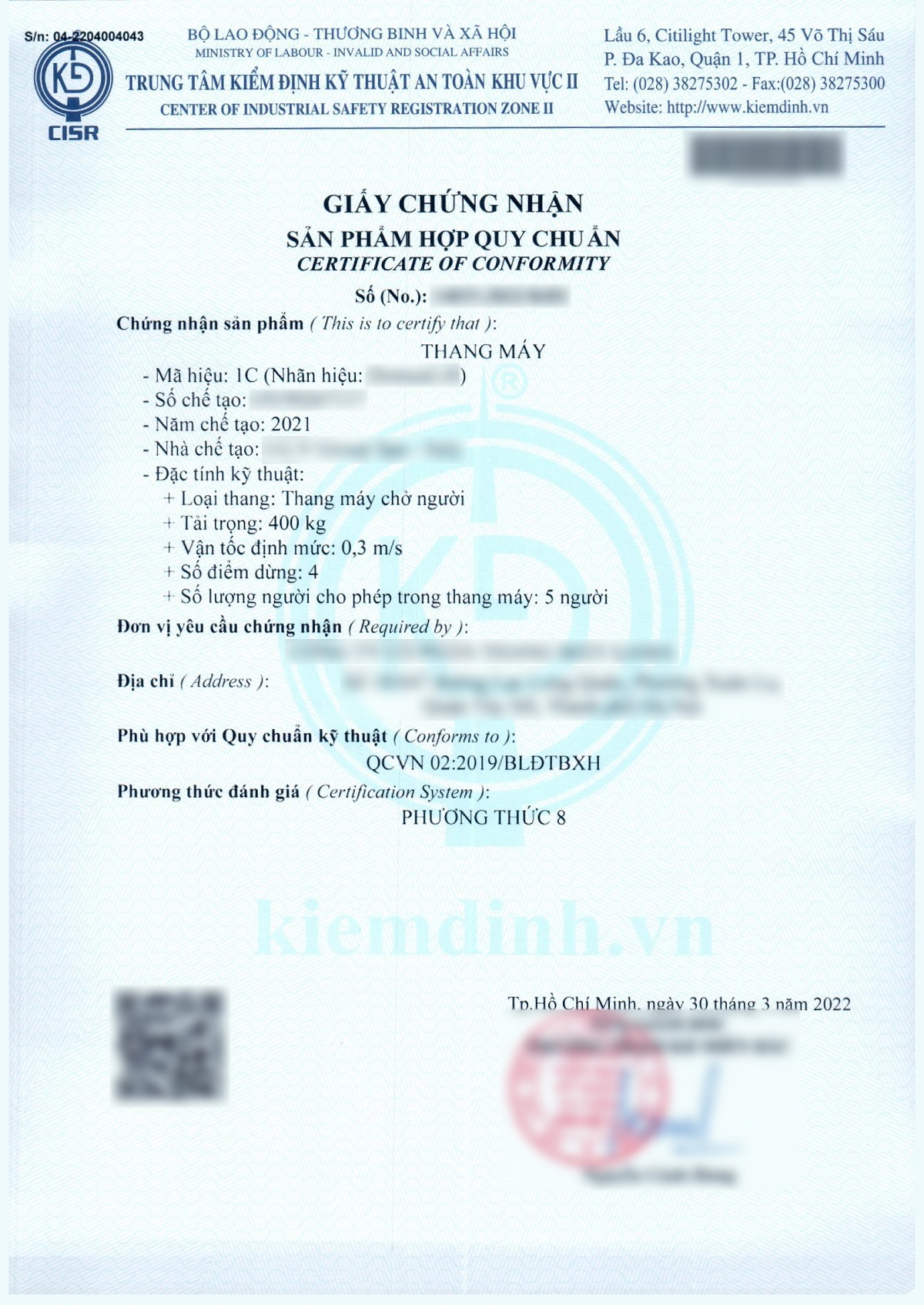In which, in condition 2, the elevator that is assessed to be in compliance with the standard will be confirmed through a certificate of conformity as shown below: