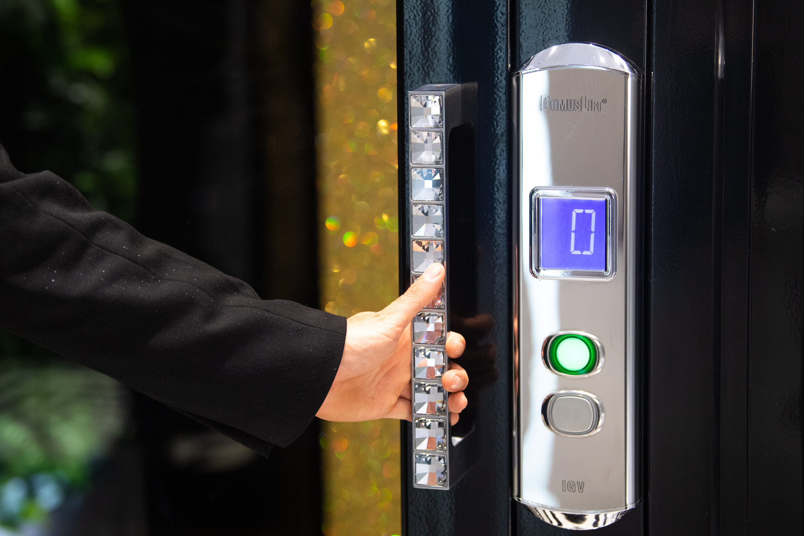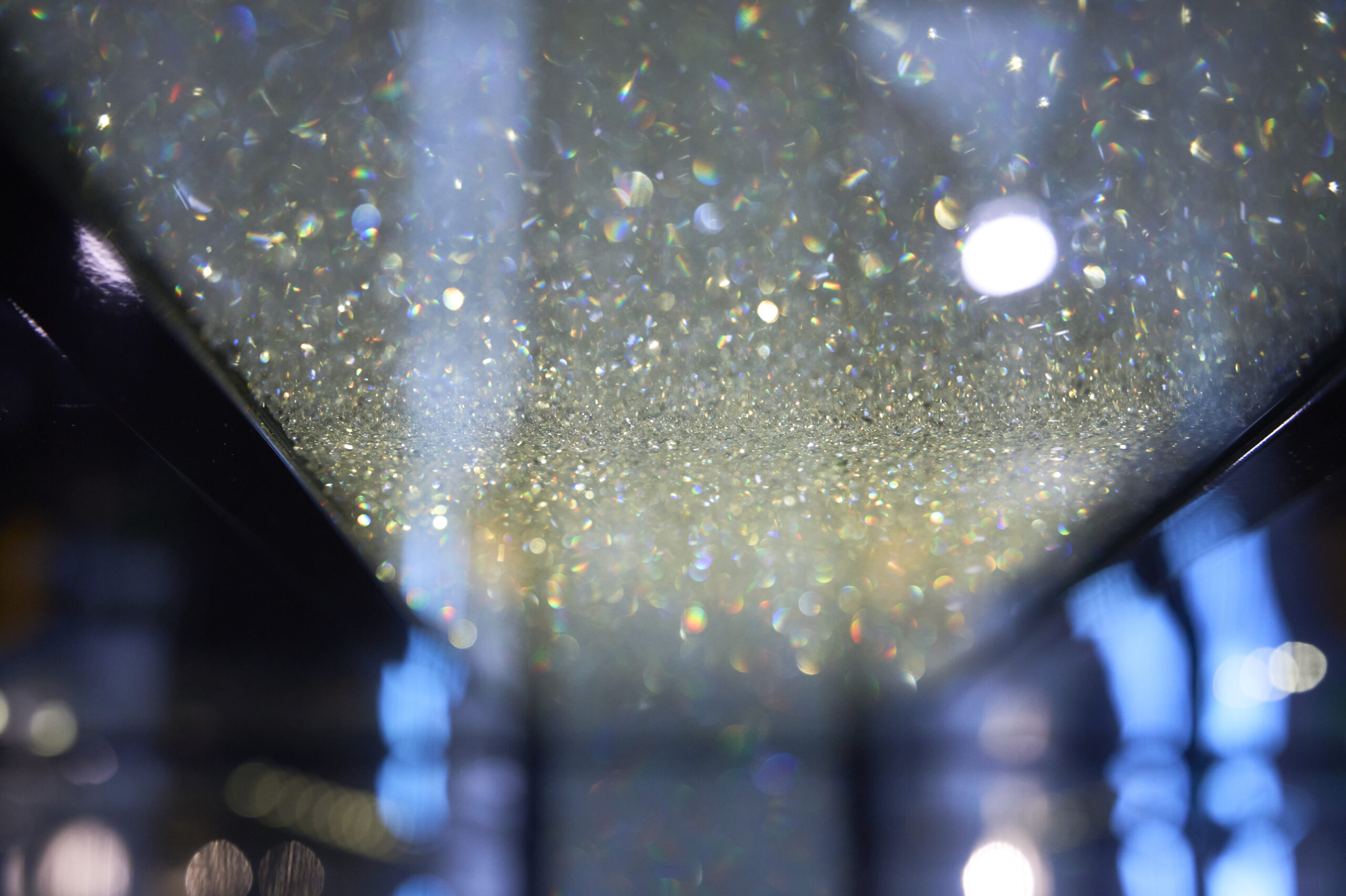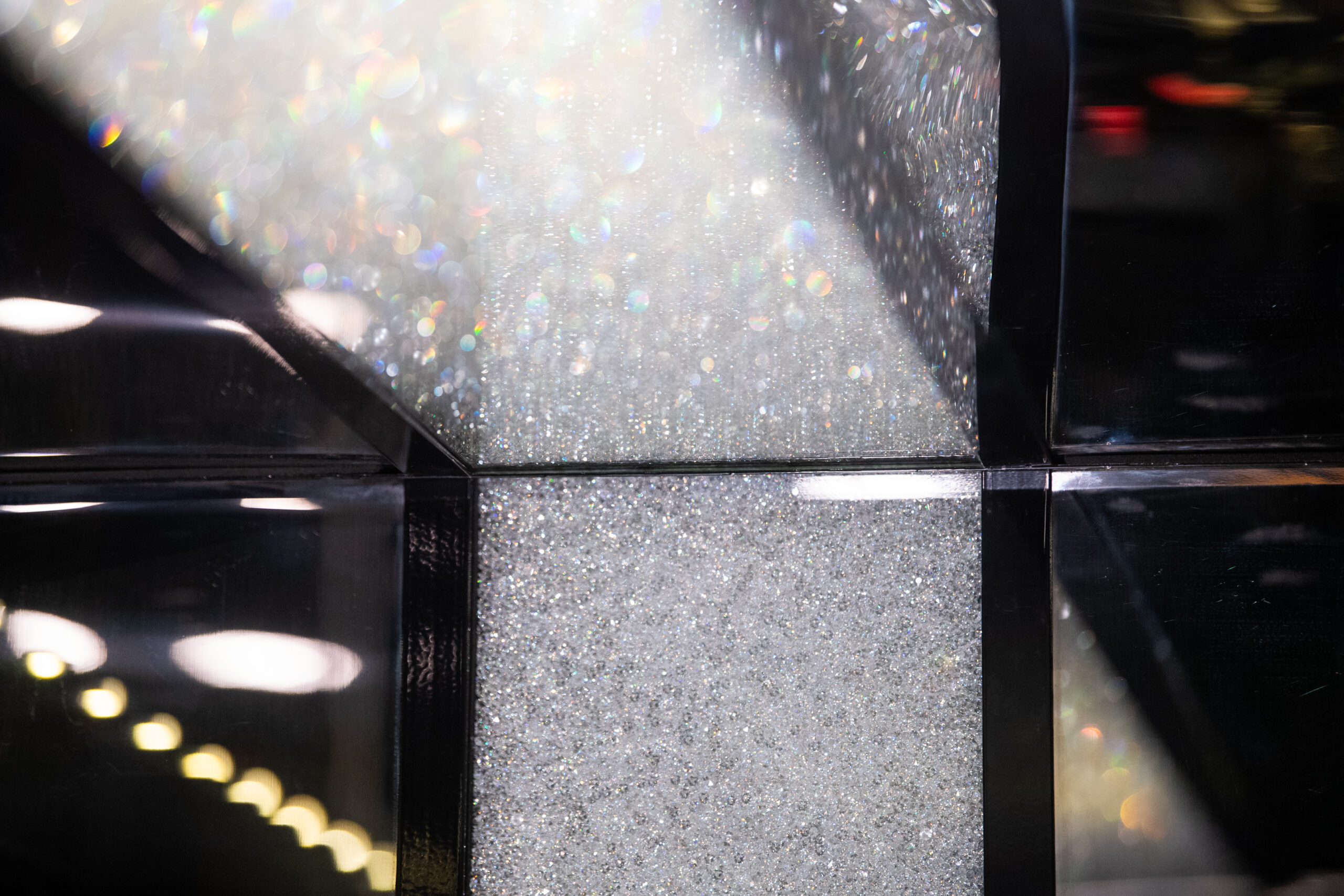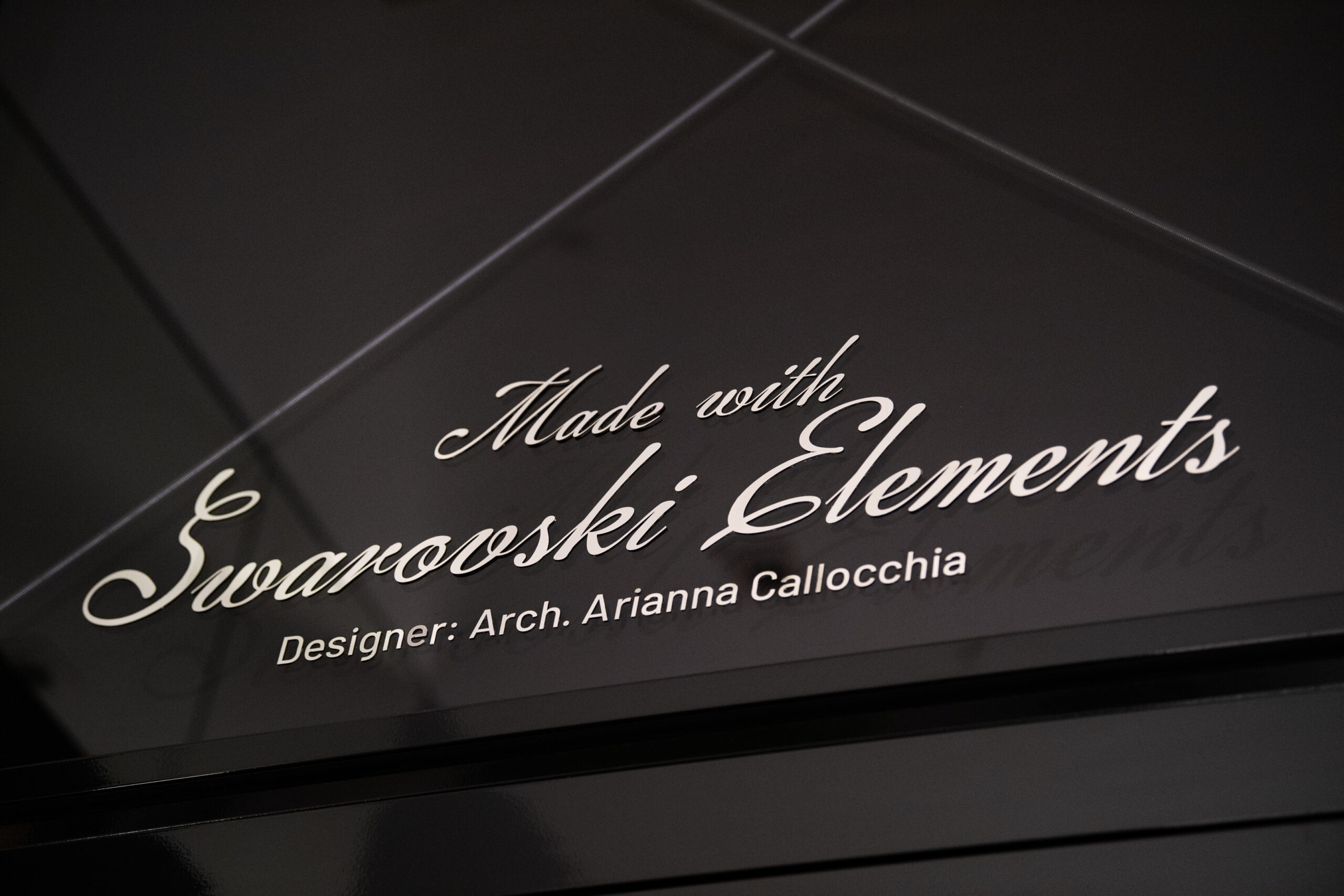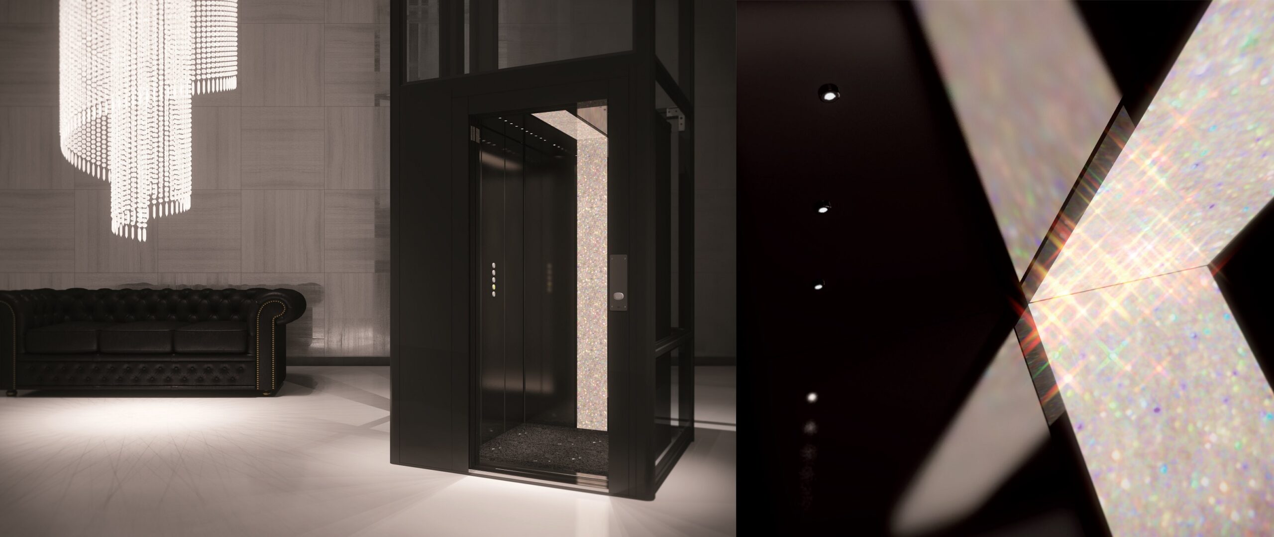 The main highlight is millions of Swarovski gemstone crystals that reflect multi-colored light meticulously dotted onto the black-walled elevator, creating luxury and sophistication.