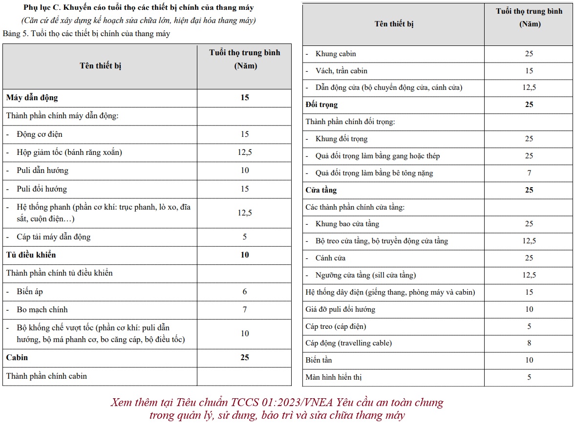 In cases where the manufacturer does not provide such information, the repair and replacement plan must follow Appendix B of TCCS 01/2023/VNEA – Safety Requirements for Elevator Management, Use, Maintenance, and Repair, which specifies the recommended service life for fast-wearing elevator components.
