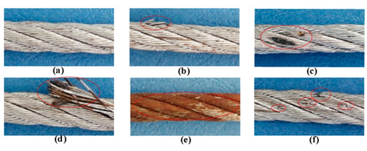 Illustrations of Damaged Hoist Ropes: (a) Normal; (b) Severed Rope; (c) Worn; (d) Deformed (Strand Breakage); (e) Corroded; (f) Fatigue Failure (Fracture due to Fatigue).