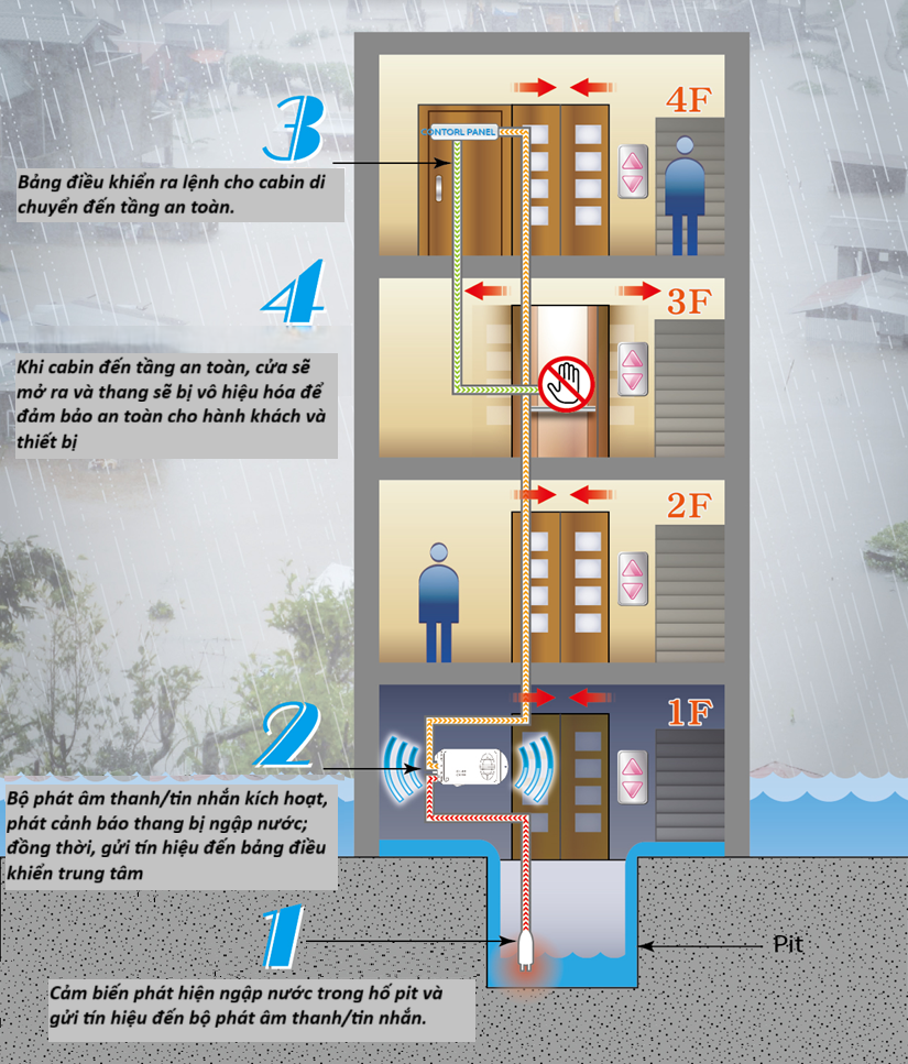 While QCVN 02/2019 on elevators does not mandate water resistance ratings for electrical devices, for installations in flood-prone areas, minimizing risks requires all pit-bottom equipment to be certified with at least IP67 water protection, shielding the system from severe damage. At the first sign of water ingress from floors, ceilings, or vents, immediately disconnect power, shut down the elevator, isolate the battery, and trip the main breaker to ensure safety.
