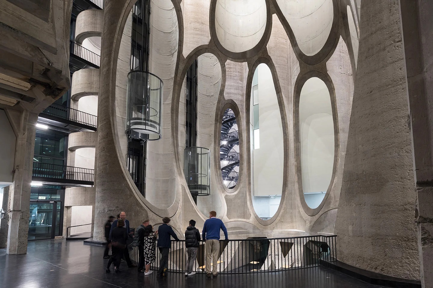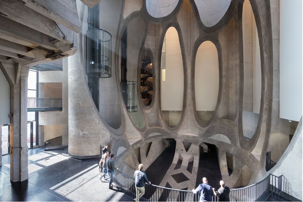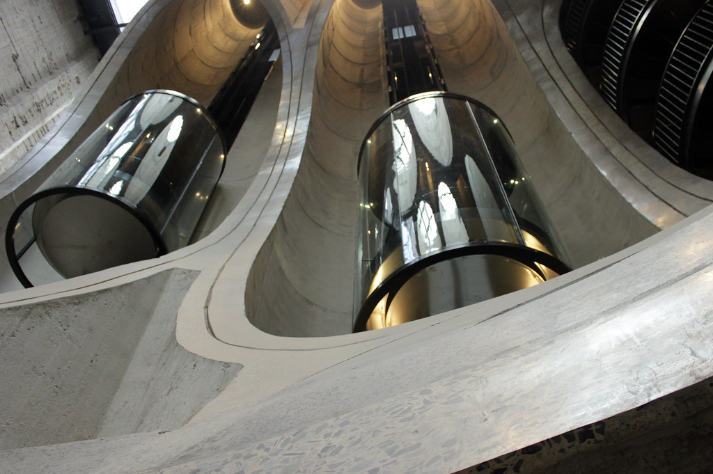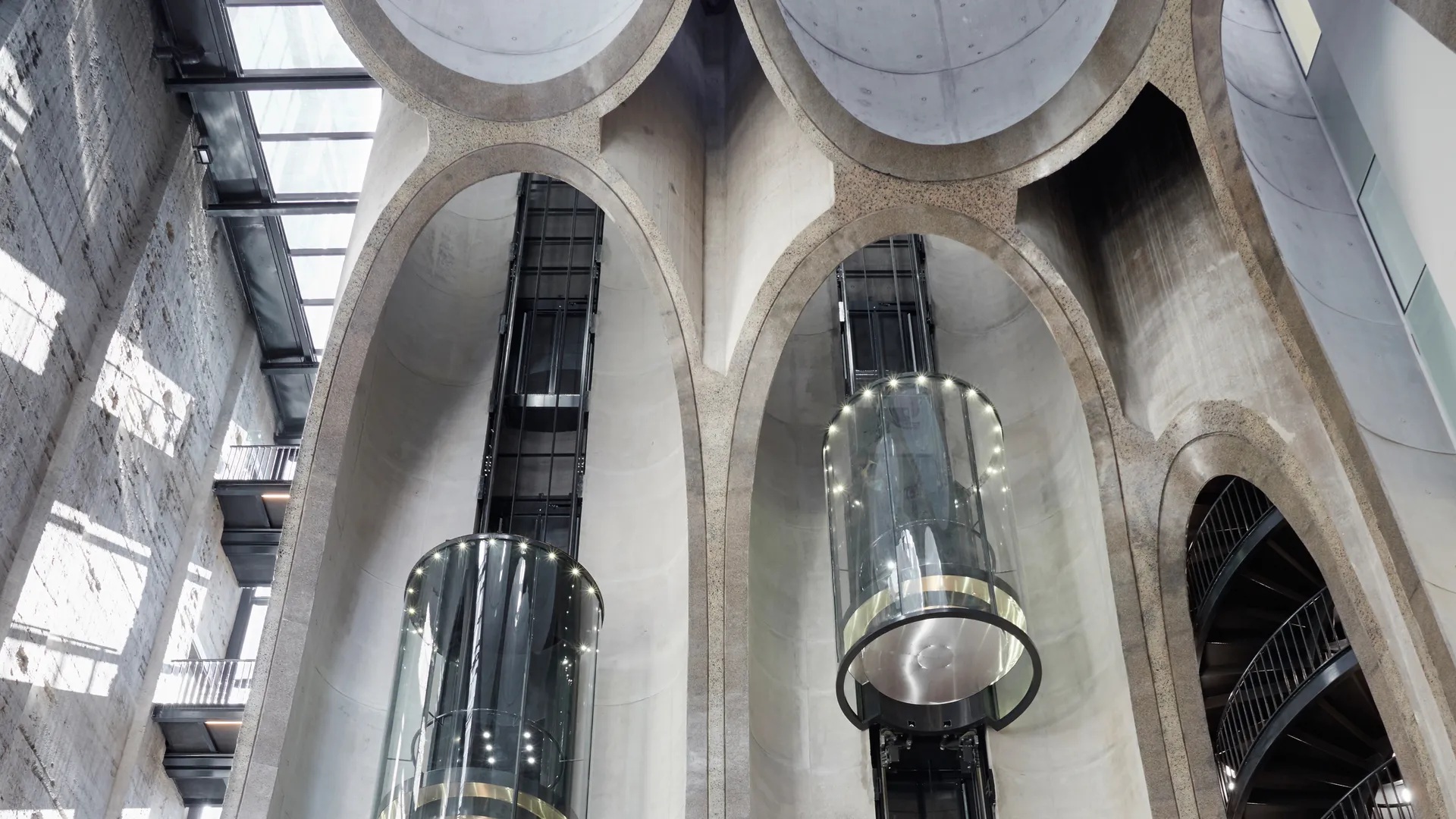 The museum lobby is equipped with two panoramic glass elevators installed directly within the massive silo tubes that once stored grain, allowing people to observe the inner structure of the old silos as they move up and down.