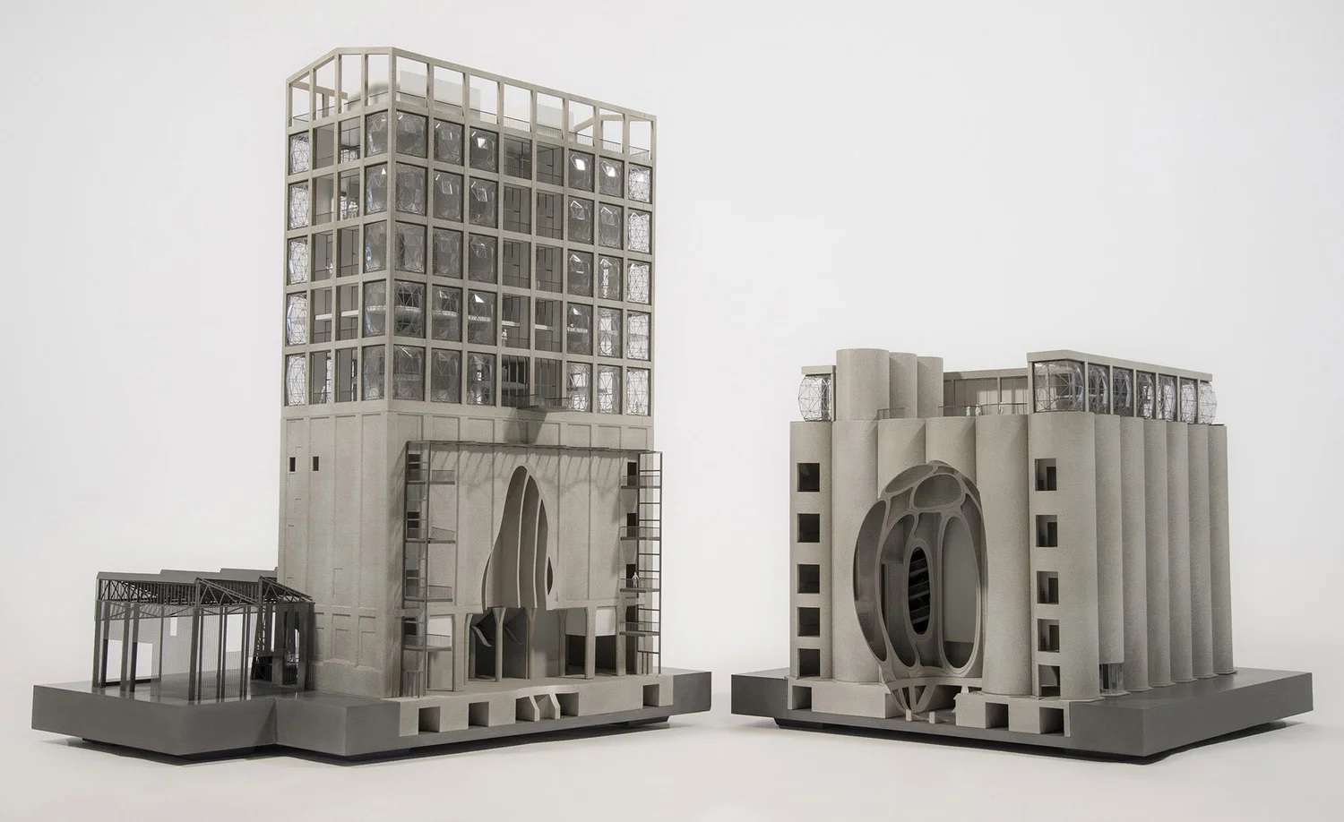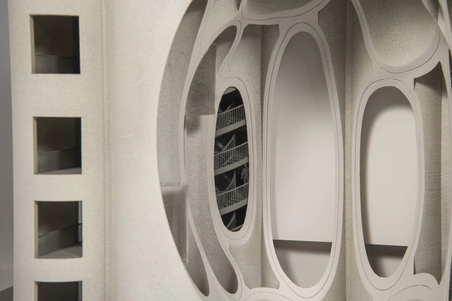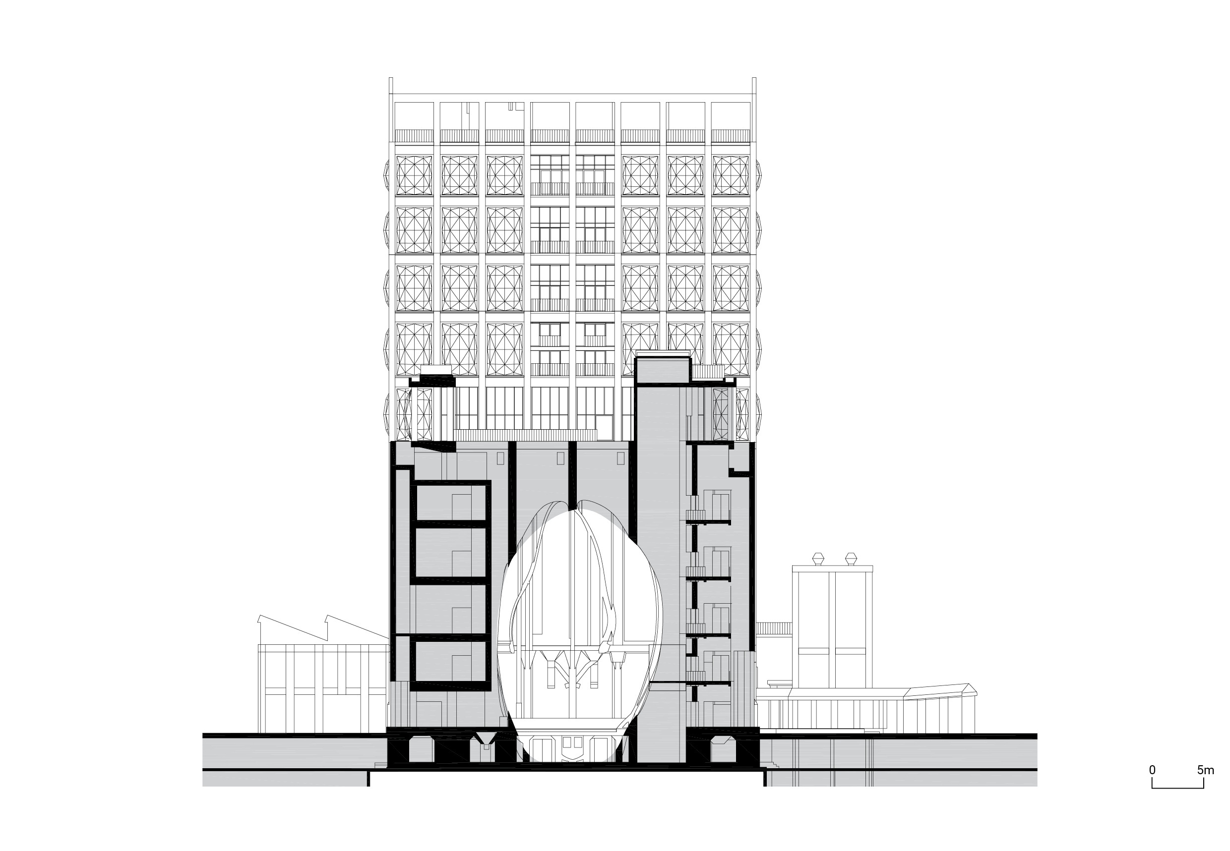 Heatherwick Studio solved this challenge by hollowing out a portion of the central silo tubes, creating an elliptical atrium with soft curves, soaring and hollow at the heart of the building — a space that functions as both a skylight and the main central lobby.