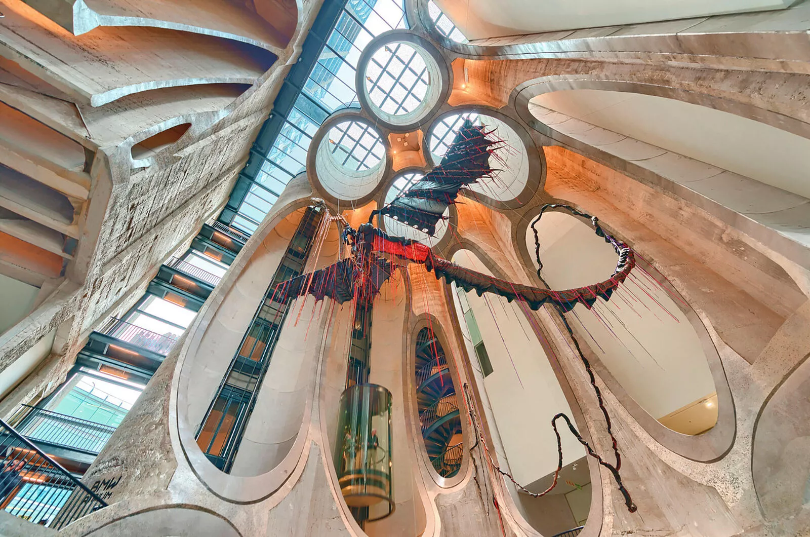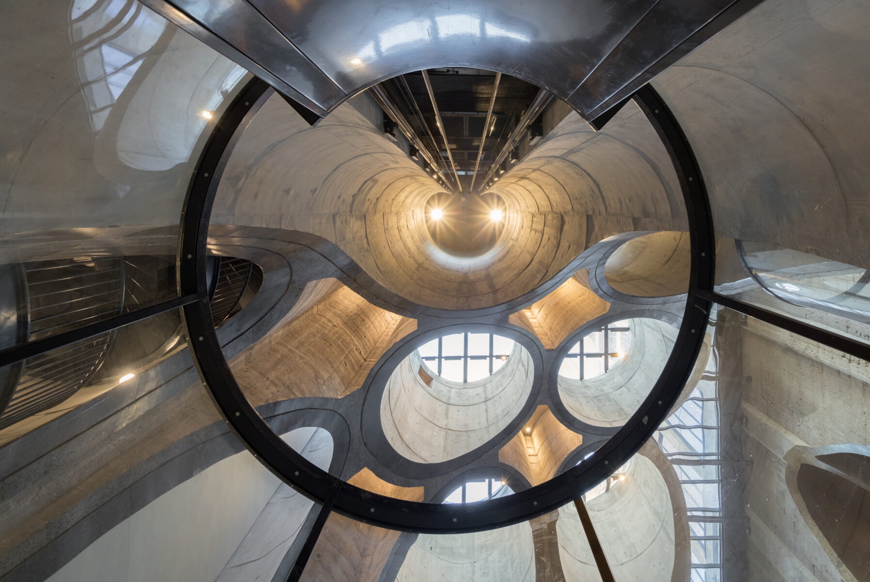 The remaining silo tubes were transformed into a complex network of galleries, staircases, and elevator shafts, ensuring full functionality while preserving the distinctive character of the original industrial structure.