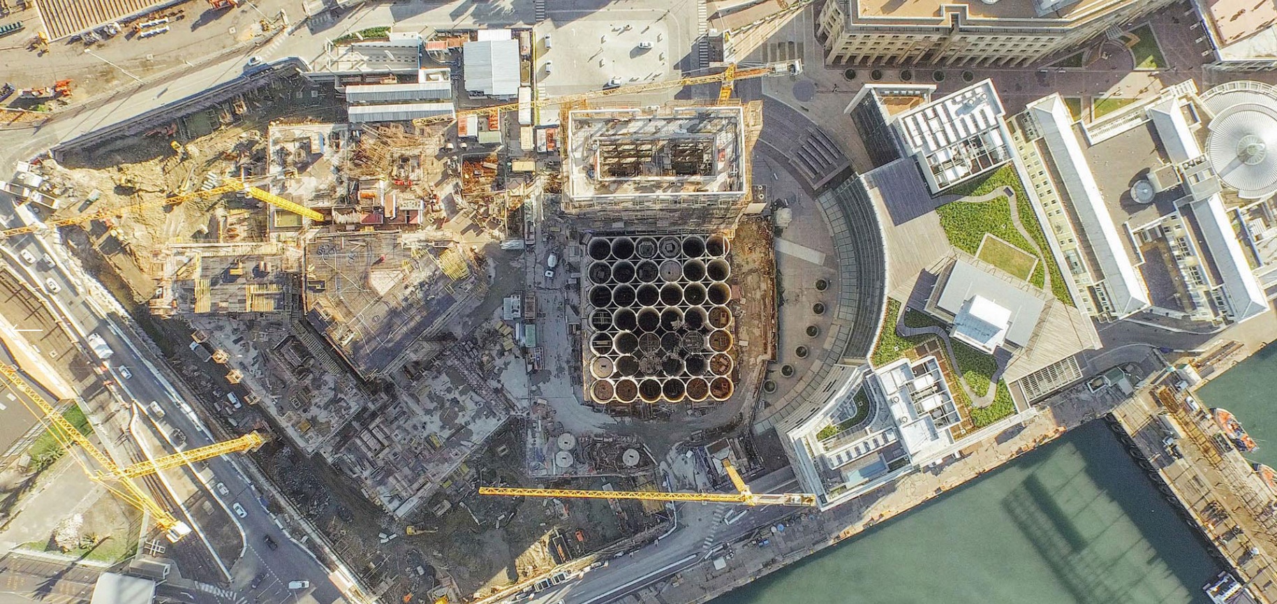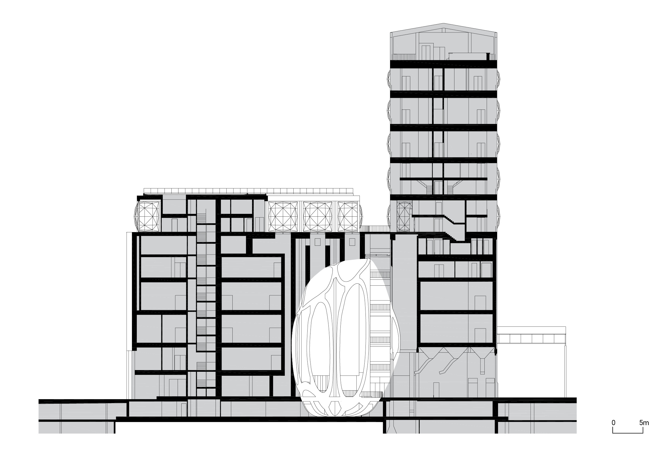 Because the silo tubes provided essential structural support for the entire building, the design team collaborated closely with structural engineers to ensure that carving into the concrete would not compromise the building’s integrity. Their solution was to reinforce each 5.5-meter-diameter silo with a 25-centimeter-thick layer of reinforced concrete before making any cuts to create the atrium.