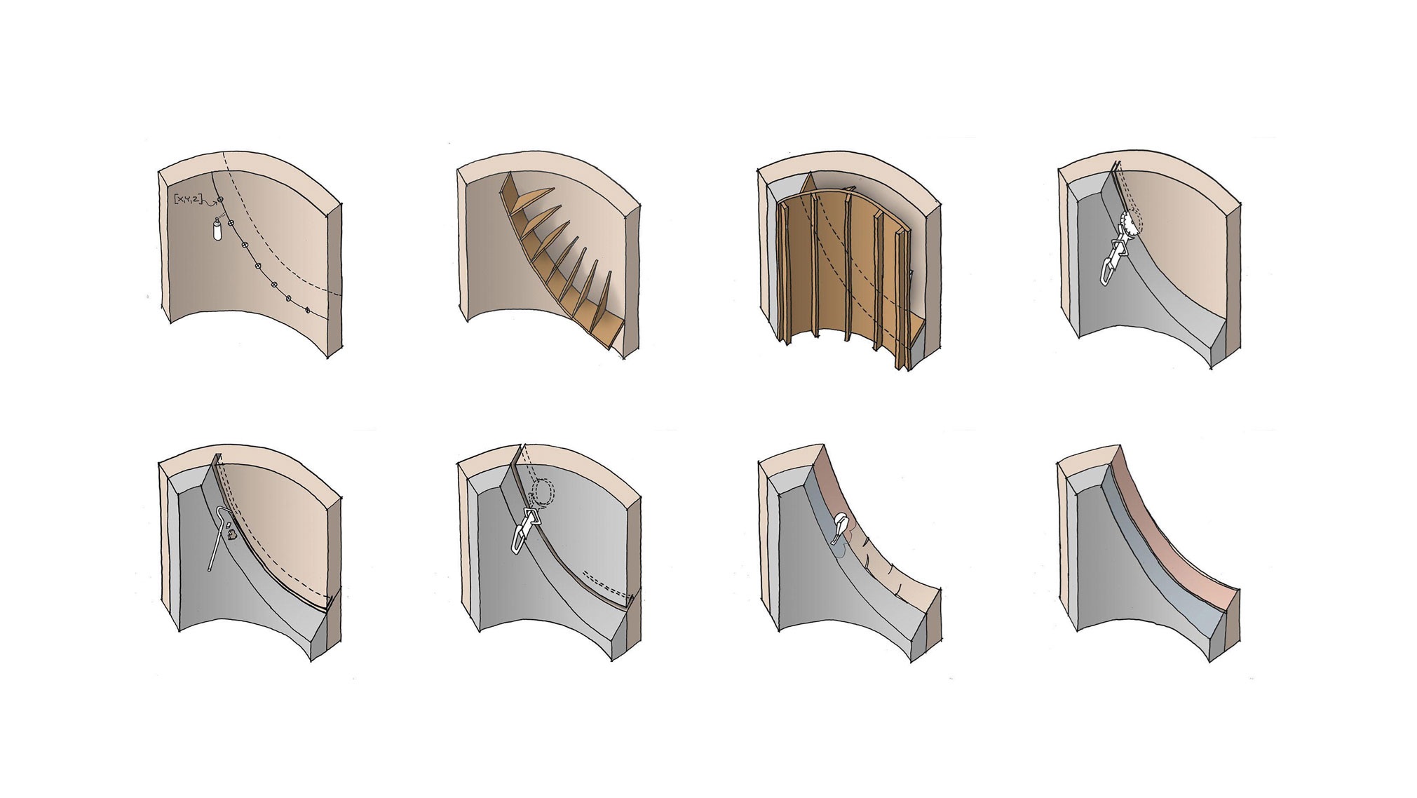 Models illustrating the process of assembling formwork, pouring new reinforced concrete, and cutting through old structural layers