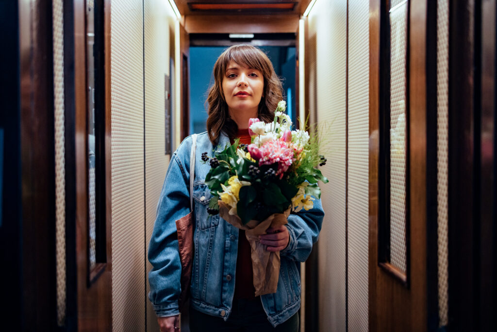 Quite late at night, when returning home with a bouquet, there was only a young girl in the elevator, holding a bouquet with a youthful expression, whispering something.